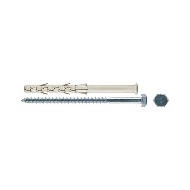 Dybel ramowo-elewacyjny do murów otworowych , koszulka nylonowa z długą strefą rozporową , wkręt z łbem sześciokątnym , ocynkowany na biało .