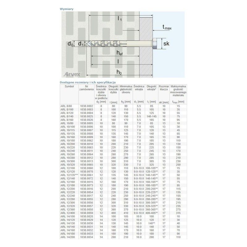 Arvex DYBEL RAMOWY ŁEB SZEŚCIOKĄTNY ARL 12/140MM