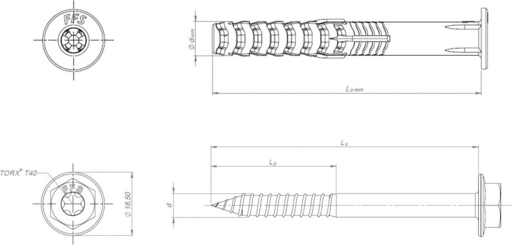 FFS Kołek ramowy poliamidowy z krótką strefą rozporu z kołnierzem 10x120mm i wkrętem z łbem heksagonalnym