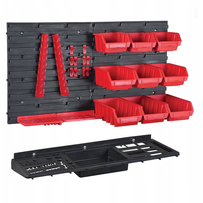 W skład zestawu wchodzą także pojemniki magazynowe Ergobox w różnych rozmiarach, które są idealne do przechowywania drobnych narzędzi i akcesoriów. Czerwone akcesoria Fixing Wall A11 i B12 nie tylko dodają estetyki, ale także ułatwiają organizację, co sprawia, że korzystanie z zestawu jest jeszcze bardziej komfortowe.