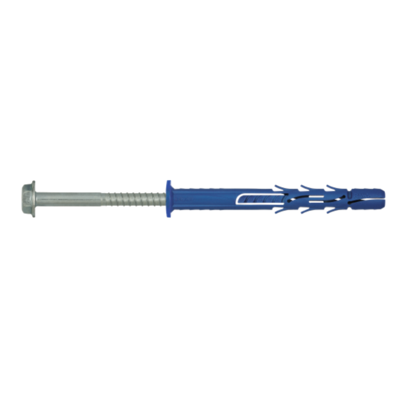 Uniwersalny kołek ramowy z kołnierzem i wkrętem z łbem heksagonalnym zabezpieczonym powłoką nylonową antykorozyjną rekomendowany do szerokiego spektrum aplikacji
