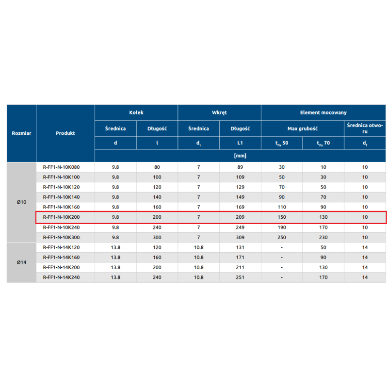 Kołek ramowy FF1 9,8x200mm kołnierz nylon 25szt. - R-FF1-N-10K200