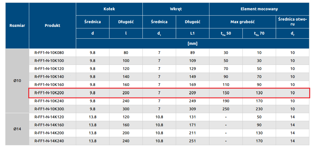 - Kołek ramowy FF1 z kołnierzem przeznaczony do mocowania twardych materiałów, jak stal