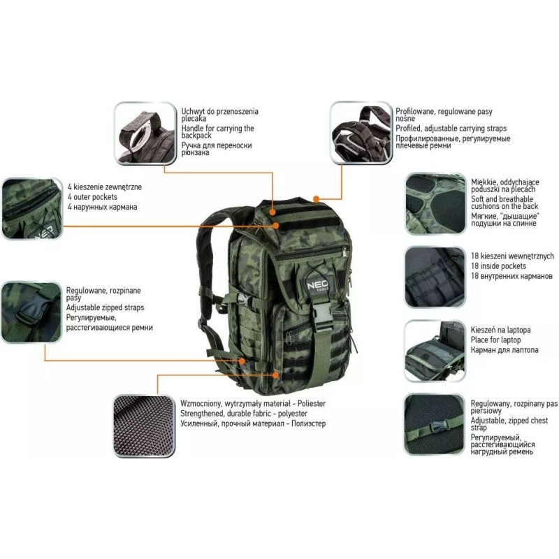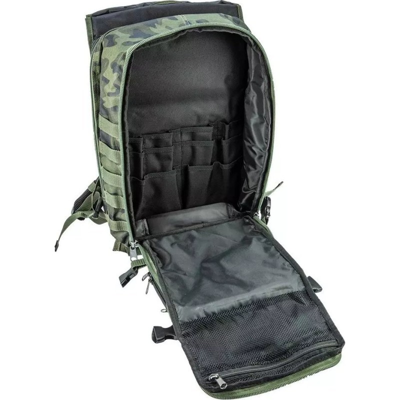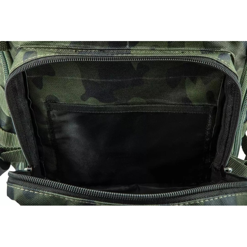 Wygodny plecak taktyczny z pojemną kieszenią główną. Plecak pomieści i zabezpieczy ładunek w wielkości 30 l. Dla wygody przechowywania umieszczono w nim 18 wewnętrznych oraz 4 dodatkowe kieszenie zewnętrzne zapinane na suwak. Plecak dzięki swojej konstrukcji jest niezwykle komfortowy w użytkowaniu. Posiada regulowane pasy ramienne, regulowany pas piersiowy i biodrowy, poduszki na plecach, ściągacze boczne i górne, a także dodatkowe troki.