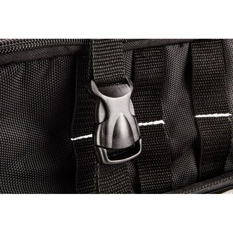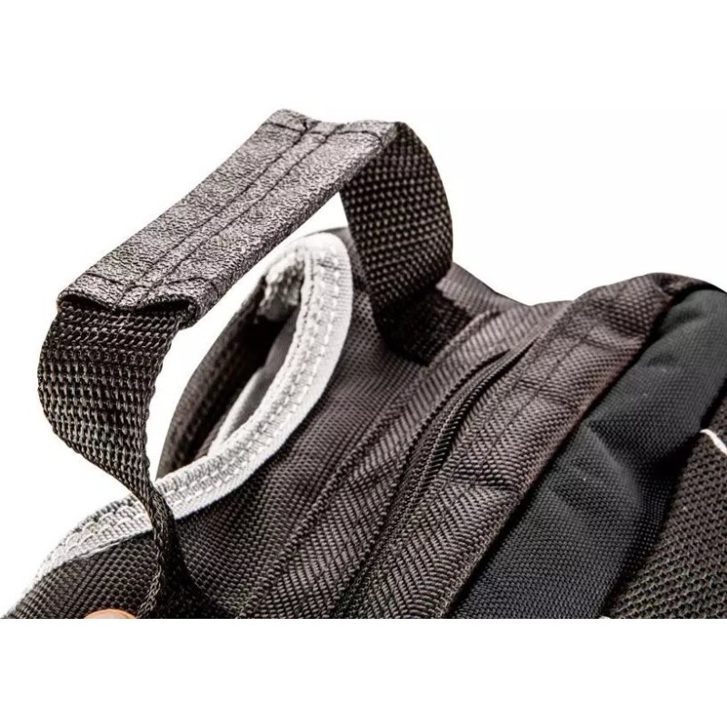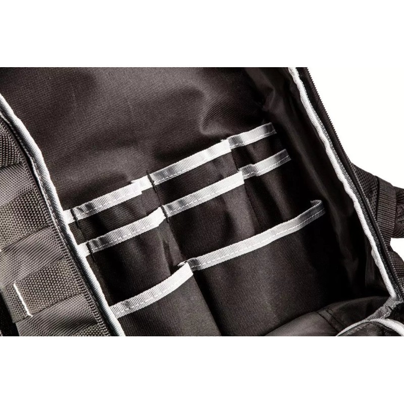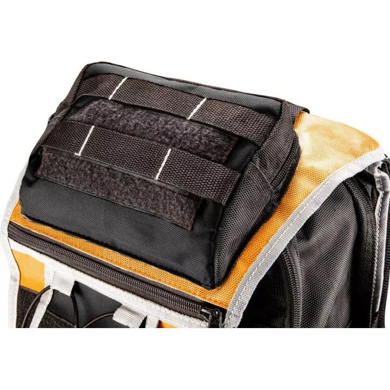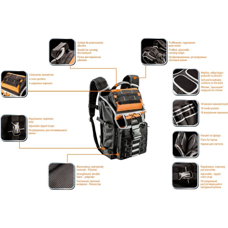 Plecak monterski NEO (nr ref. 84-304) wykonany z trwałego poliestru 600 D, gwarantującego długoletnią trwałość torby. Plecak wyposażony jest w 4 zewnętrzne i 18 wenętrznych kieszeni na narzędzia ułatwiających przechowywanie i transport. Dla komfortu plecak posiada profilowane pasy nośne wraz z pasem piersiowym oraz oddychającymi plecami. Marka NEO spełnia oczekiwania profesjonalistów.