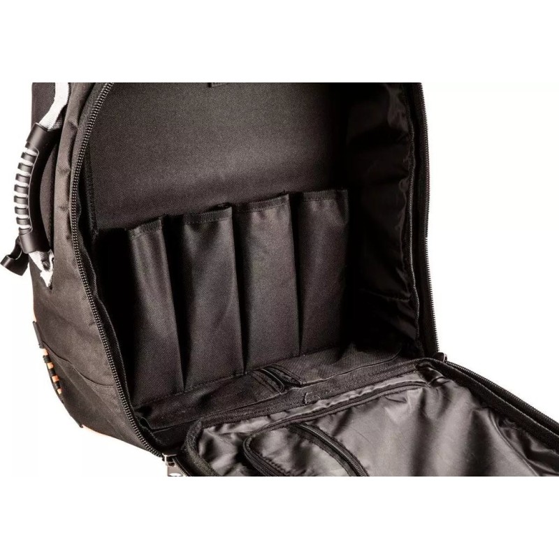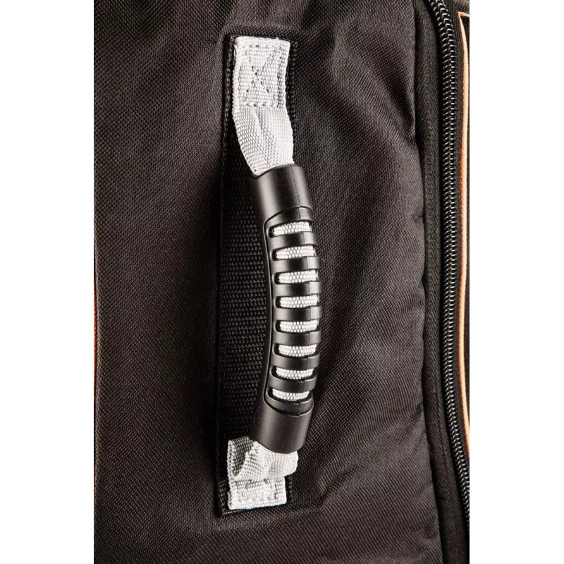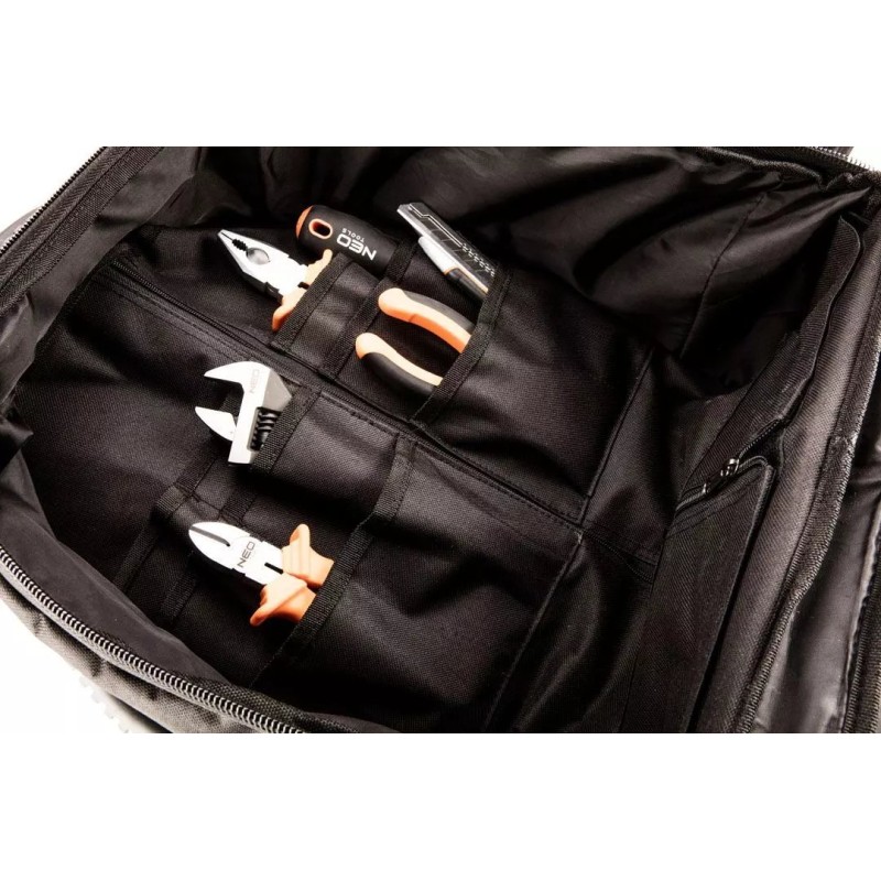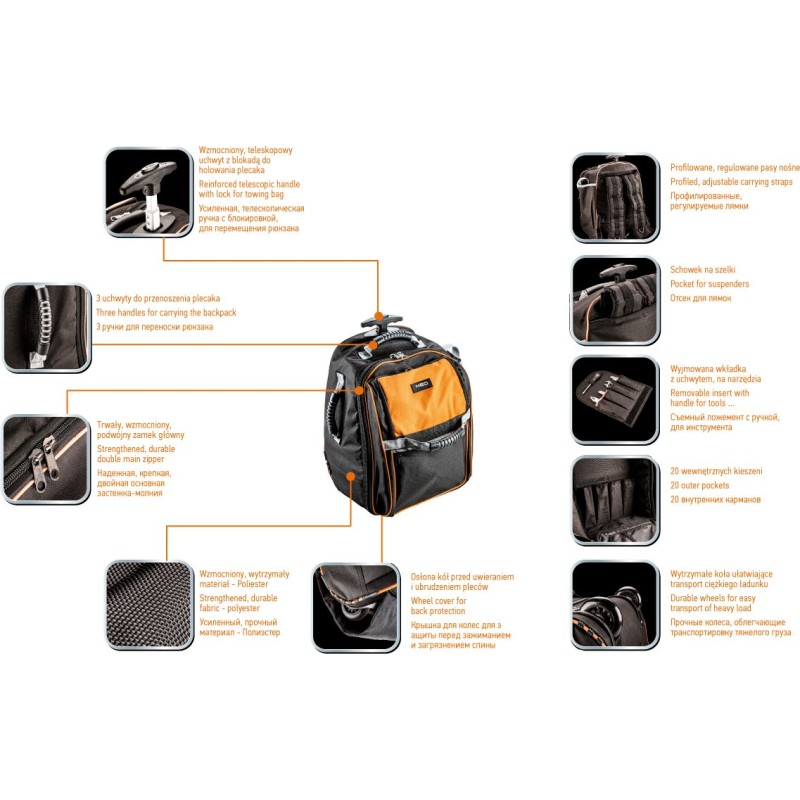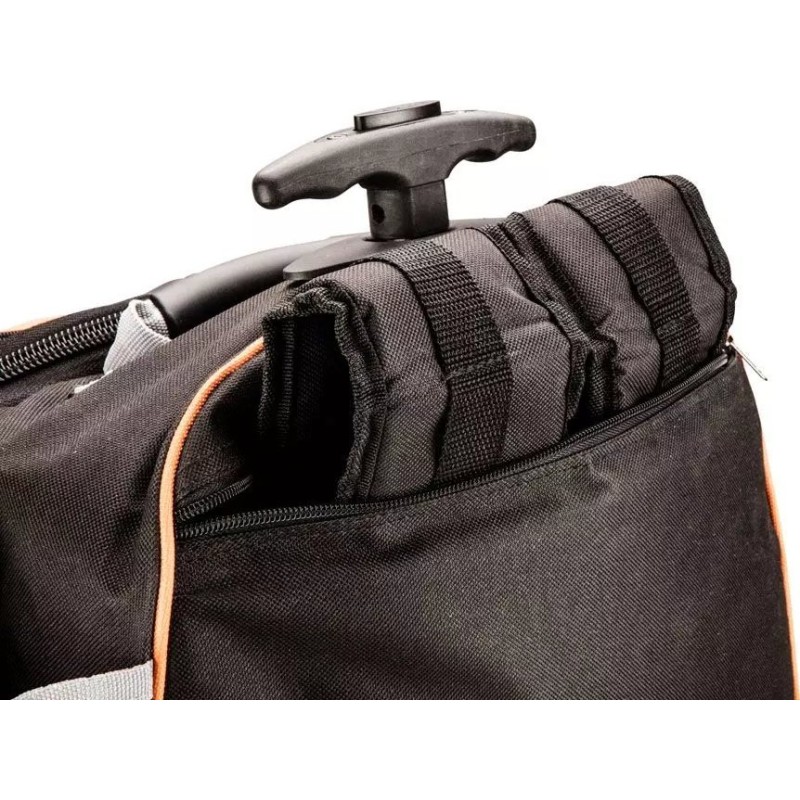 Plecak monterski na kołach NEO (nr ref. 84-303) wykonany z trwałego poliestru 600 D, gwarantującego długoletnią trwałość torby. Teleskopowy uchwyt z blokadą wraz z mocnymi kołami ułatwi transport ciężkiej zawartości. Plecak wyposażony jest w 3 uchwyty do przenoszenia ręcznego, 20 kieszeni wewnętrznych i wyjmowaną wkłądkę na narzędzia dla ułatwienia pracy. Marka NEO spełnia oczekiwania profesjonalistów.