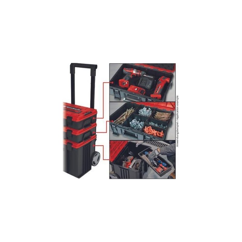 Einhell E-Case Tower. Kolor produktu: Czarny, Czerwony, Materiały: Polipropylen (PP), Cechy zabiezpieczeń: Odporność na wysoką temperaturę, Splash resistant. Wymary wewnętrzne (SxGxW): 415 x 273 x 320 mm, Waga produktu: 1,01 kg, Szerokość opakowania: 450 mm. Ilość na paczkę: 1 szt.