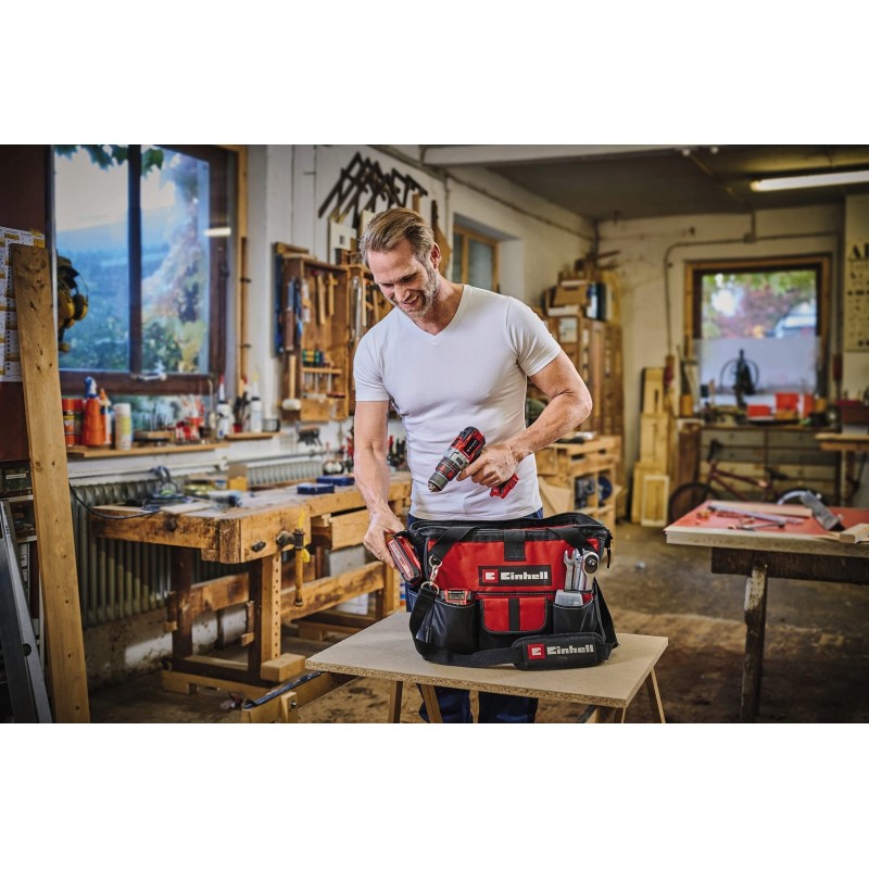 - Wiele kieszeni – Torba Einhell jest wyposażona w dodatkowe kieszenie, dzięki czemu narzędzia i akcesoria są zawsze łatwo dostępne i bezpiecznie przechowywane.