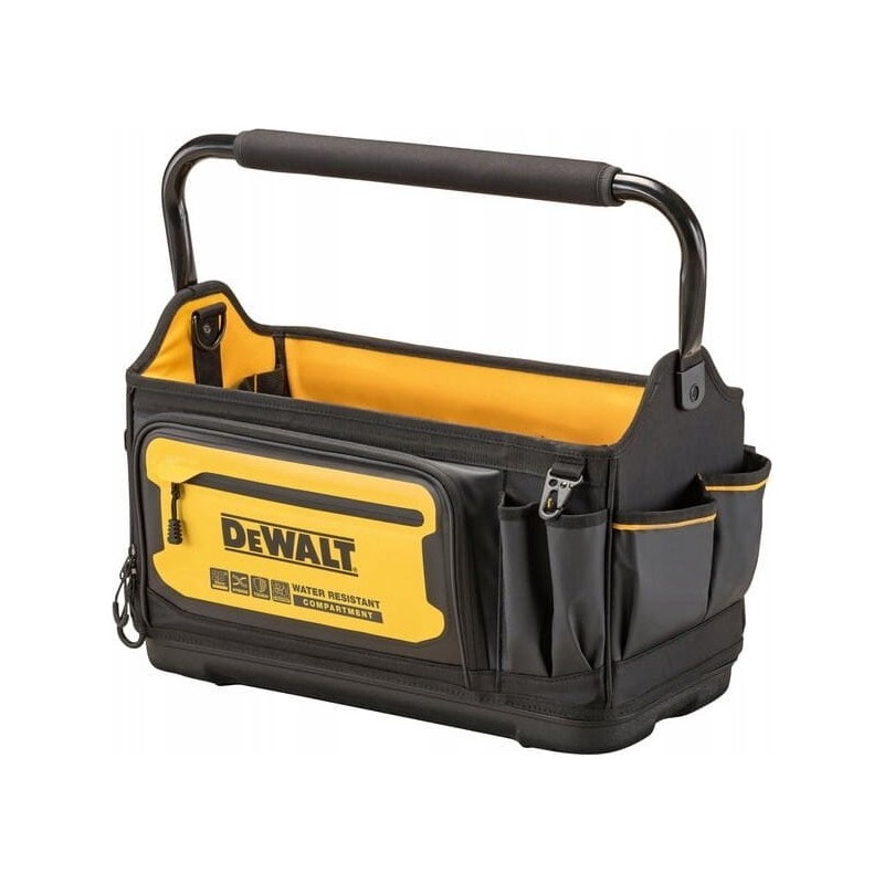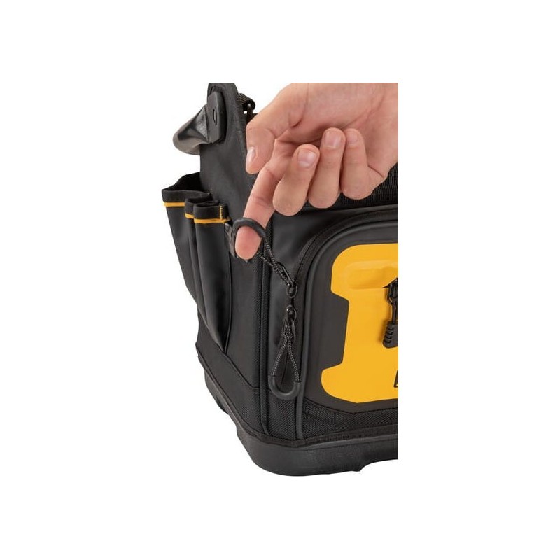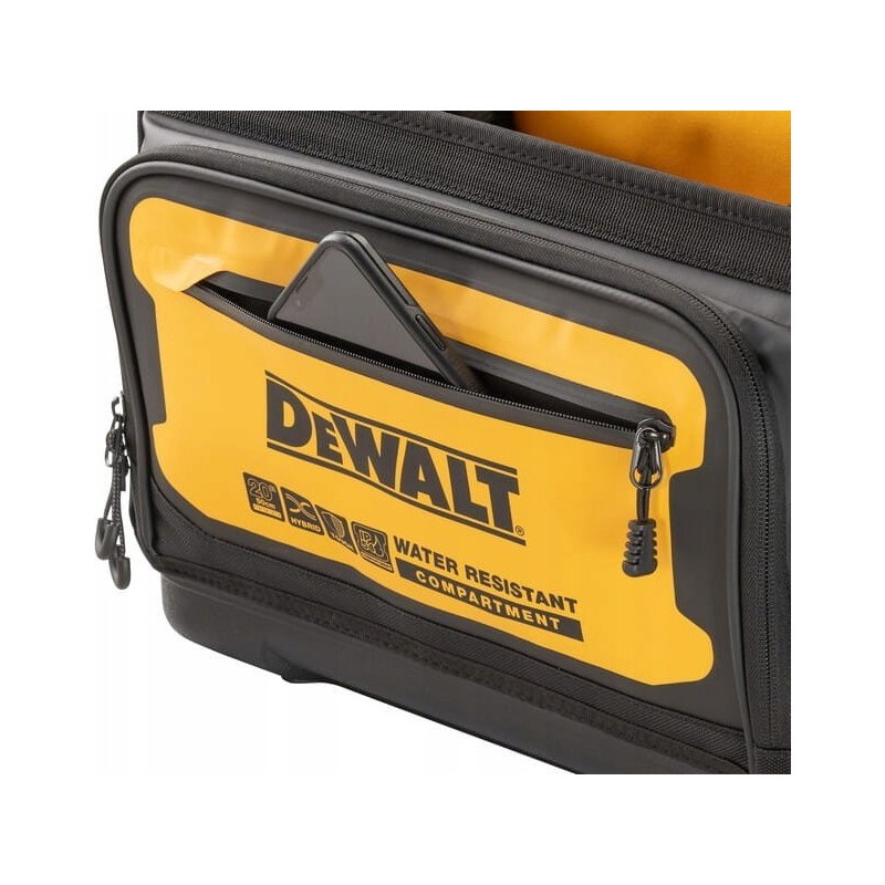 Zamykana torba na narzędzia DEWALT® 20" charakteryzuje się trwałą konstrukcją, która wytrzymuje trudne warunki, oraz wodoodporną przednią kieszenią zapinaną na zamek IP54, w której można bezpiecznie przechowywać cenne przedmioty osobiste.
