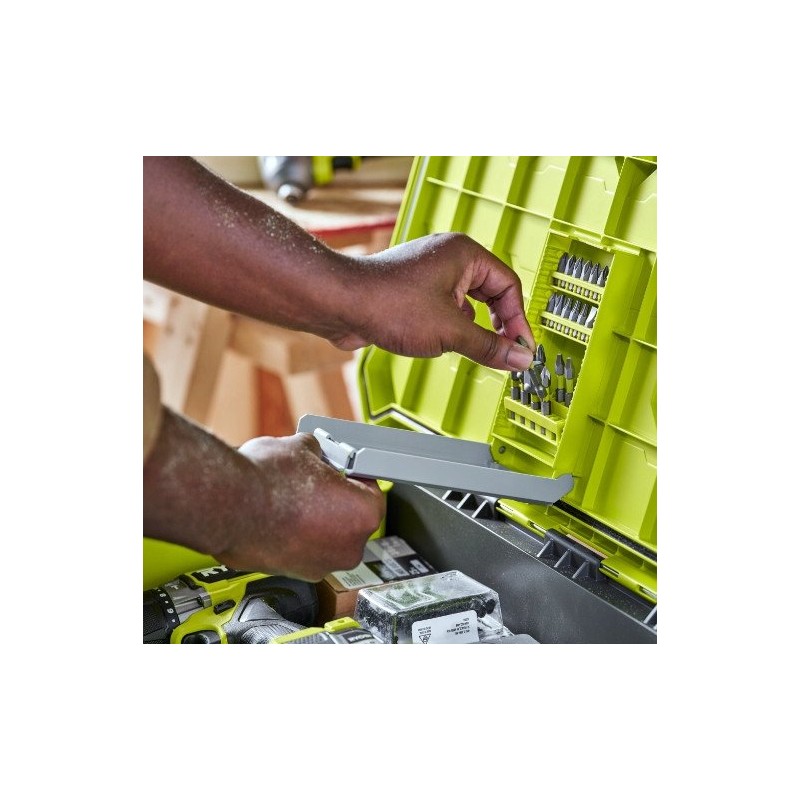 W skrzyni Ryobi RSL201 znajduje się zintegrowany organizer bitów oraz schowek na akcesoria, co zapewnia maksymalną organizację narzędzi. Dzięki temu wszystkie niezbędne elementy będą zawsze pod ręką, co znacznie ułatwia pracę. Dodatkowo, możliwość zabezpieczenia przedmiotów za pomocą kłódki zwiększa bezpieczeństwo przechowywanych narzędzi.