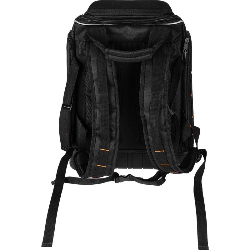 Plecak narzędziowy ze wzmocnieniem, pojemność 20L, komora główna, 4 zewnętrzne kieszenie, 35 wewnętrznych kieszeni, materiał polyester 600D, wymiary: szerokość 370 mm, głębokość 275 mm, wysokość 515 mm, gumowana podstawa plecaka, sztywna rama plecaka.