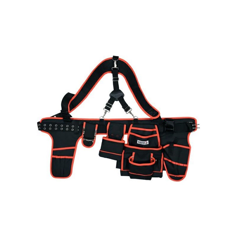 Pas narzędziowy na szelkach z dwiema zakładanymi dużymi kaburami na elektronarzędzia ,metalowym uchwytem na młotek i jedną głęboką kieszenią na gwoździe lub wkręty. Długość pasa głównego zapinanego na metalową klamrę wynosi około 1280 mm . Jest on połączony z szerokim pasem nośnym mocowanym na szerokich szelkach. Szelki równoważą obciążenia przenosząc je z bioder na ramiona . Taka konstrukcja pasa ułatwia pracę z większym obciążeniem . Całość wykonana z technicznej wodoodpornej tkaniny poliestrowej OXFORD 600D.