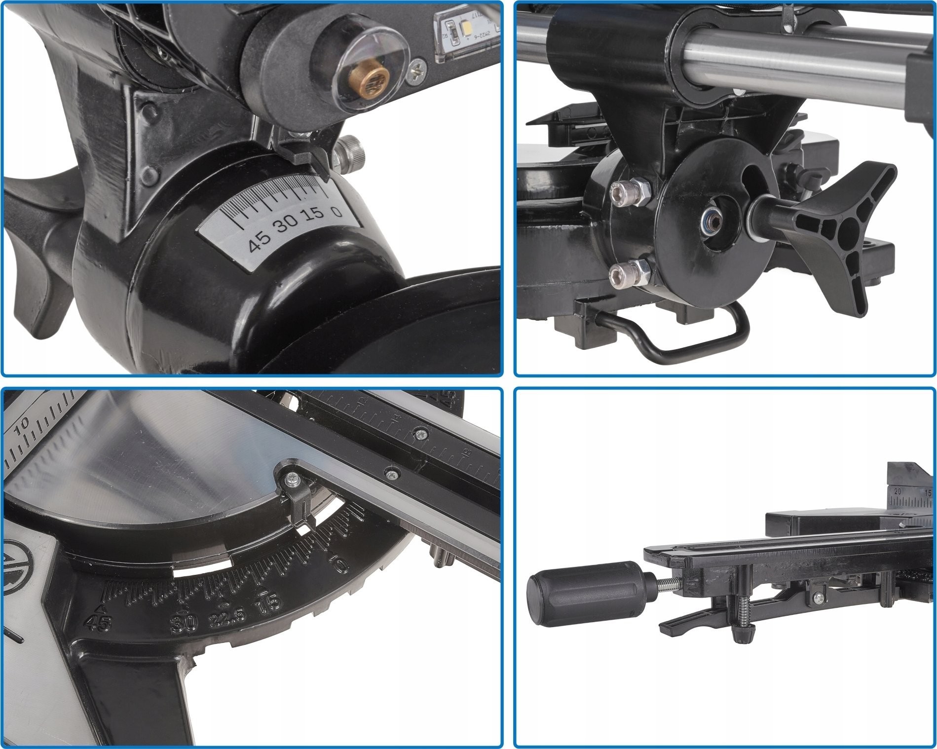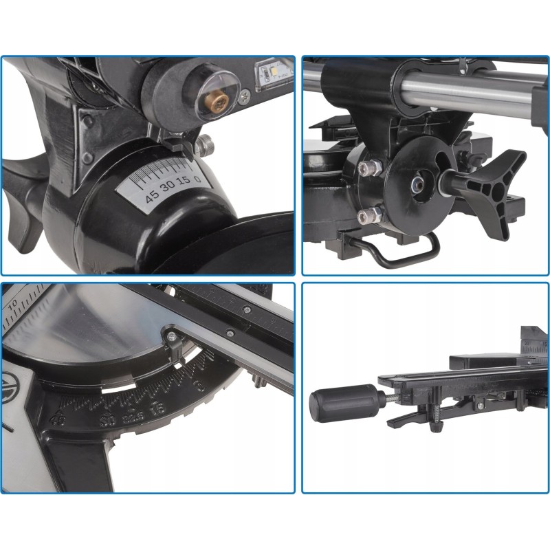 - Posuw umożliwiający cięcie o długości 340 mm przy ustawieniu podstawy w pozycji 0°, ustawienie podstawy w pozycji 45° pozwala wykonać cięcie o długości 240mm