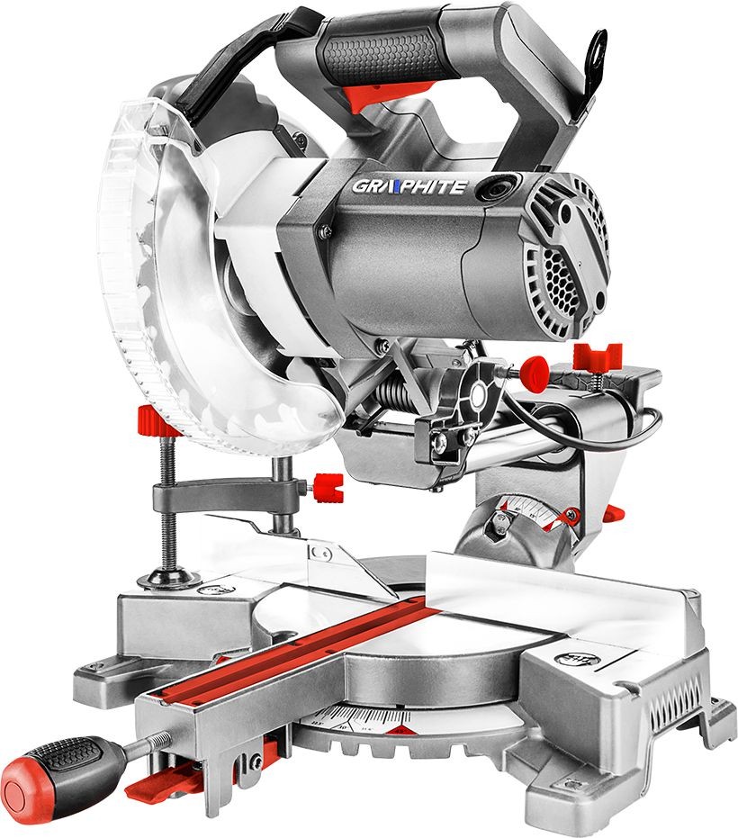 - Pilarka ukosowa GRAPHITE z funkcją posuwu głowicy, napędzana silnikiem o mocy 1400 W, przeznaczona do precyzyjnego cięcia dużych elementów drewna i materiałów drewnopochodnych