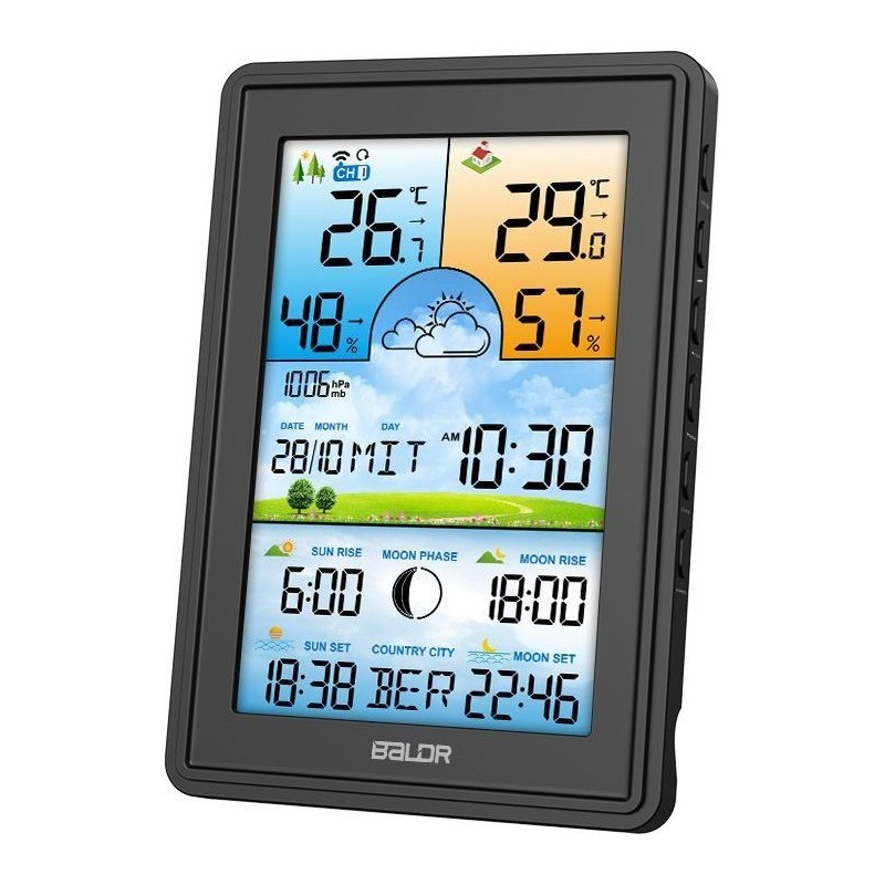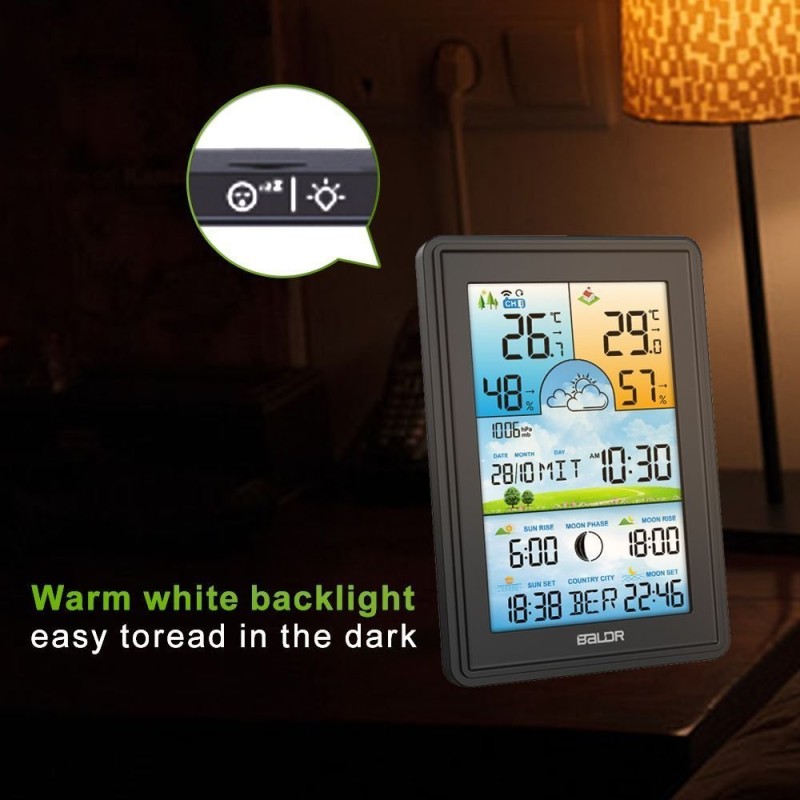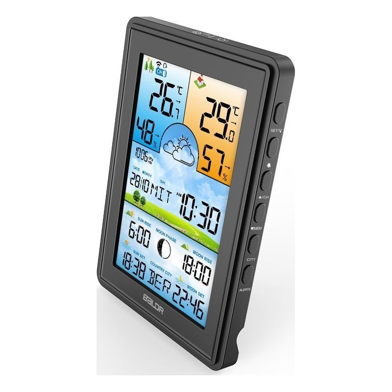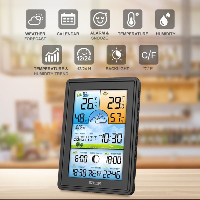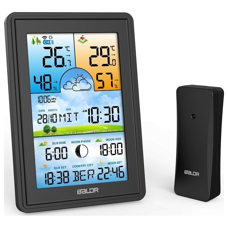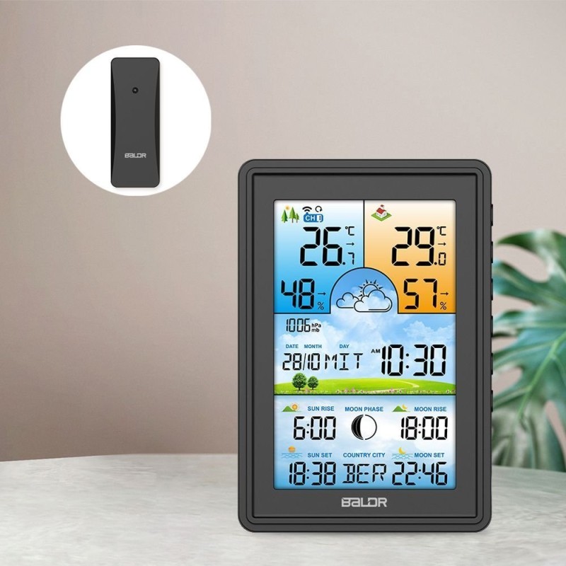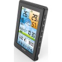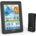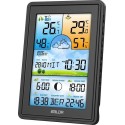 Bezprzewodowa stacja pogodowa termometr higrometr zegar fazy księżyca kalendarz budzik z drzemką czarna