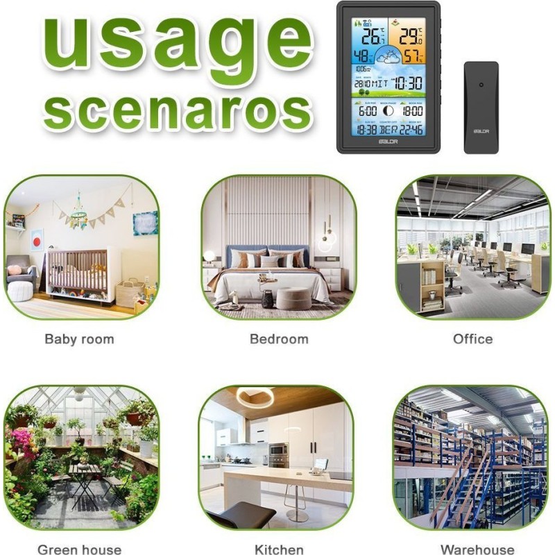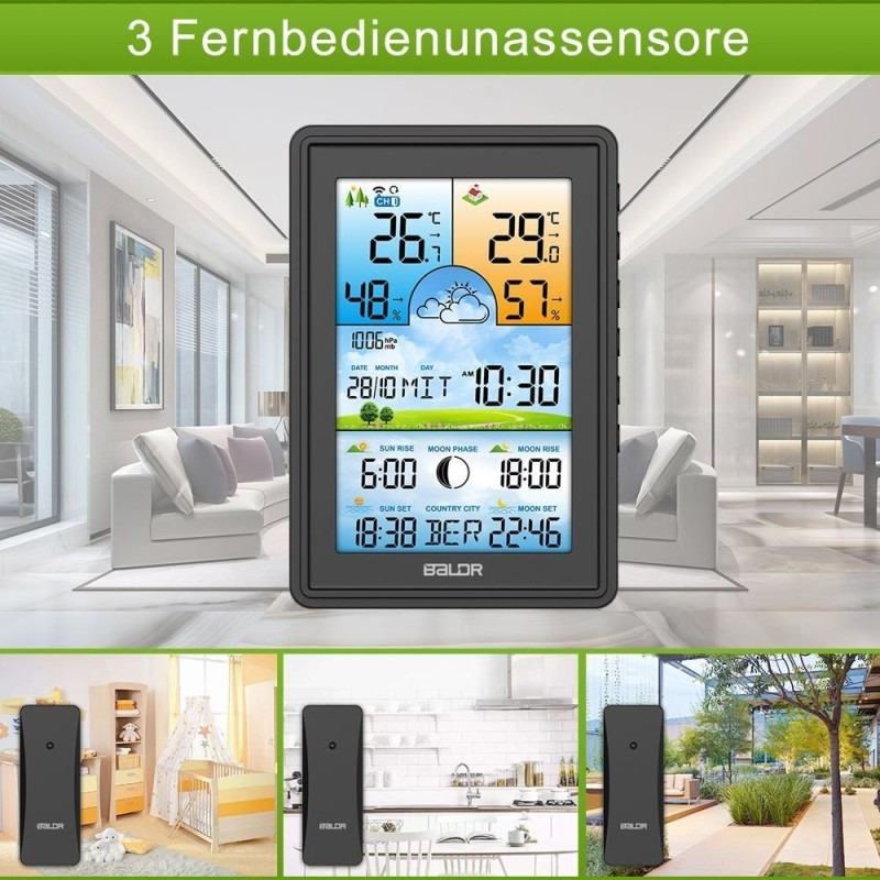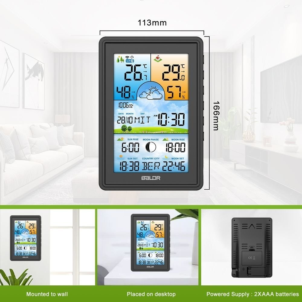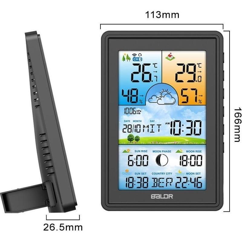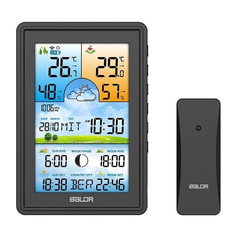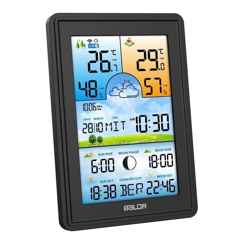 Bezprzewodowa stacja pogodowa termometr higrometr zegar fazy księżyca kalendarz budzik z drzemką czarna