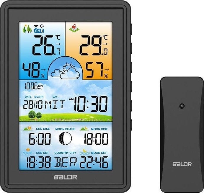 - Funkcje: budzik, pamięć pomiarów maksymalnych i minimalnych, pomiar ciśnienia, pomiar temperatury wewnętrznej, pomiar temperatury zewnętrznej, pomiar wilgotności, prognoza pogody, radiowa synchronizacja czasu (DCF), zegar