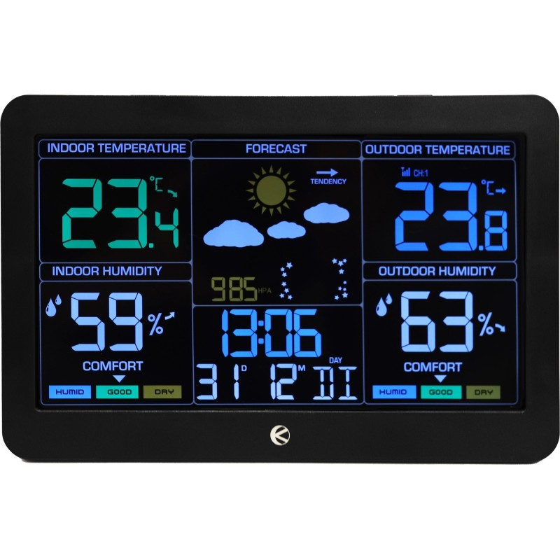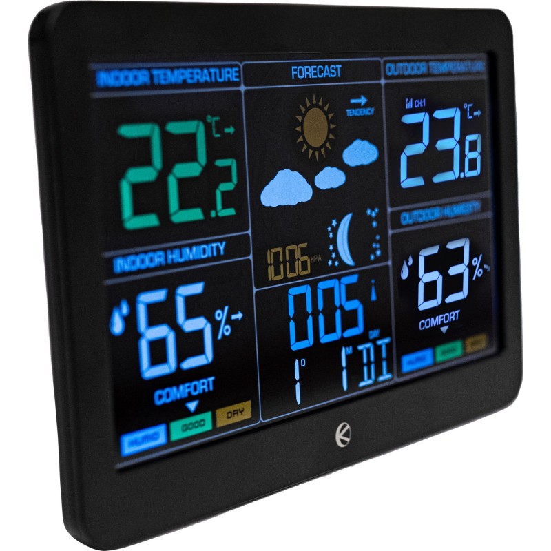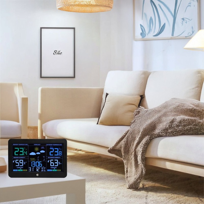 Stacja pogodowa wyróżnia się dużym, kolorowym wyświetlaczem LCD, który jest podświetlany, co zapewnia doskonałą widoczność w każdych warunkach oświetleniowych. Dodatkowo, możliwość dostosowania jasności wyświetlacza sprawia, że urządzenie harmonijnie wkomponowuje się w wystrój wnętrz, nadając mu nowoczesny charakter.