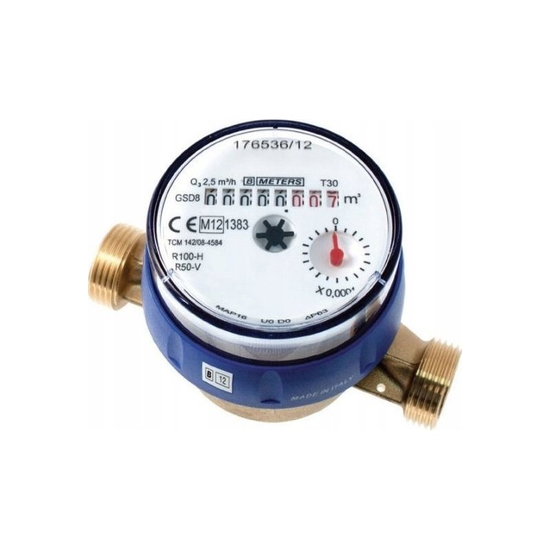 Wodociąg jednostrumieniowy, suchobieżny GSD8 BMETERS DN15 2,5m3/h, wyposażony w ośmio bębenkowe liczydło obracane o 360°. Urządzenie napędzane jest za pośrednictwem wzmocnionego, czteropolowego sprzęgła magnetycznego, które eliminuje jego zerwanie oraz poślizg dodatkowo zwiększa dokładność pomiaru wodociągu poprzez utrzymanie wirnika w hydromagnetycznym balansie. Kamień szafirowy, który jest umiejscowiony w podporze mechanizmu liczydła zapewnia urządzeniu większa czułość metrologiczna na niskie przepływy wody oraz wydłuża trwałość licznika. Wodociąg produkowany jest według dyrektywy 2004/22/WE w wersji z pierścieniem zaciskanym. Model GSD8 zgodnie z Atestem Higienicznym jest dopuszczony do pomiaru zużycia wody pitnej.
