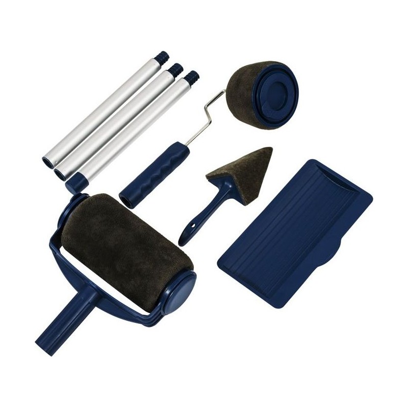 Do zestawu malarskiego wchodzą: duży wałek, którym pomalujesz większe powierzchnie (np. ściany i sufity), mniejszy wałek do malowania krawędzi, szpachelka do malowania rogów i zagłębień, przedłużany uchwyt, dozownik farby i tacka ociekowa.