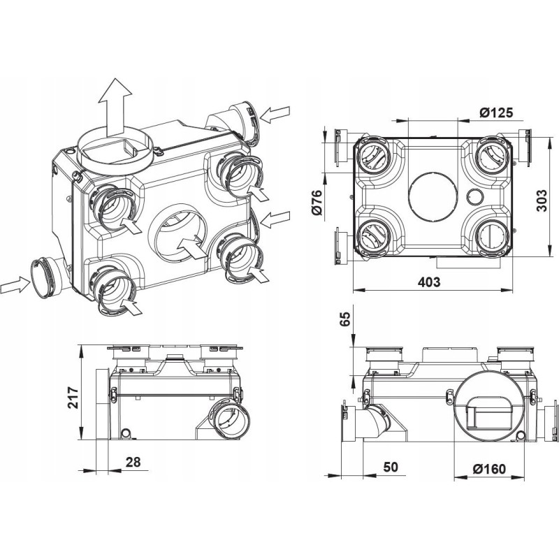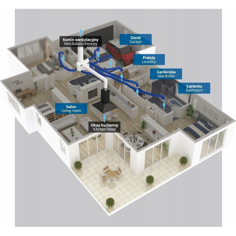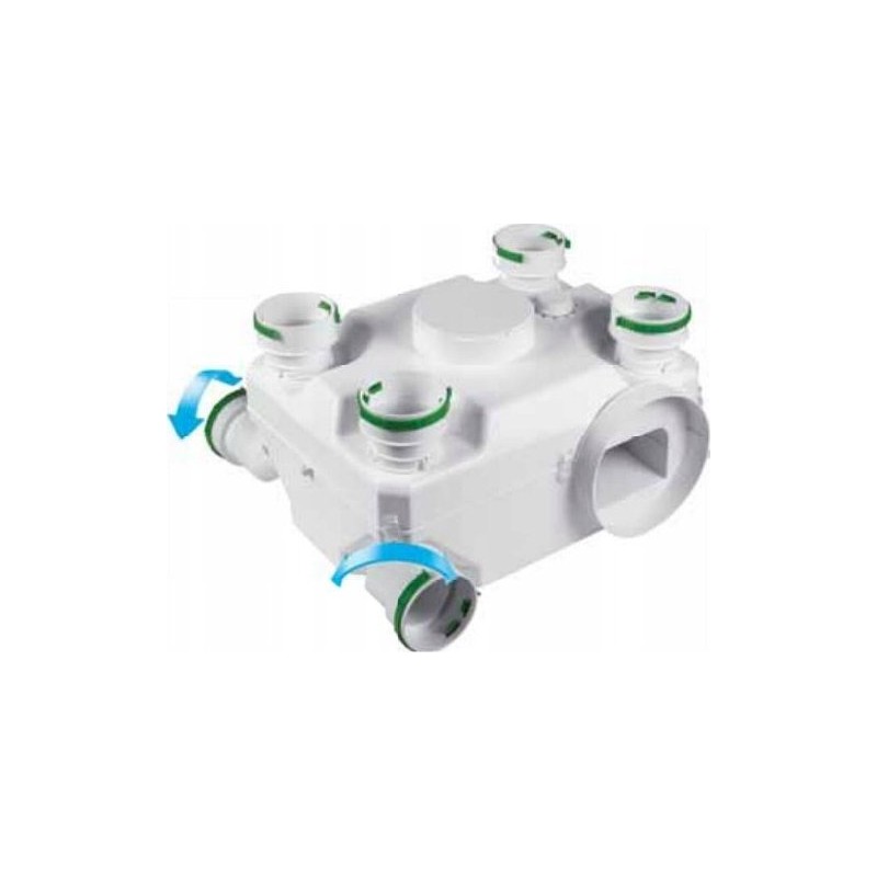 Urządzenie jest wyposażone w energooszczędny 3-biegowy silnik o dużej wydajności. Konstrukcja pozwala na podłączenie aż 7 kanałów dolotowych o średnicy O75 mm oraz jednego kanału O125 mm przeznaczonego do podłączenia okapu kuchennego.