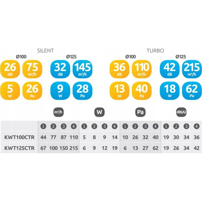 Wariant SILENT charakteryzuje się niskim poziomem hałasu oraz poborem mocy, wersja TURBO natomiast, wyróżnia się wysoką wydajnością przepływu powietrza.