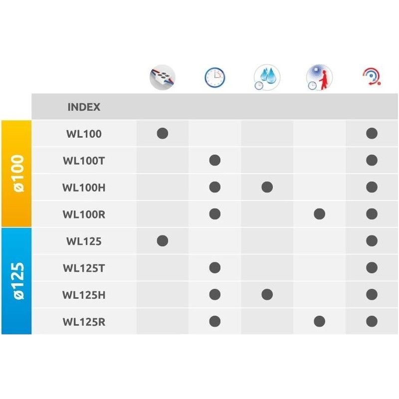 - wentylatorów w wersji z timerem WLT, gdzie wyższy bieg załączany jest za pomocą włącznika, a redukcja biegu odbywa się automatycznie po upływie 30 minut.