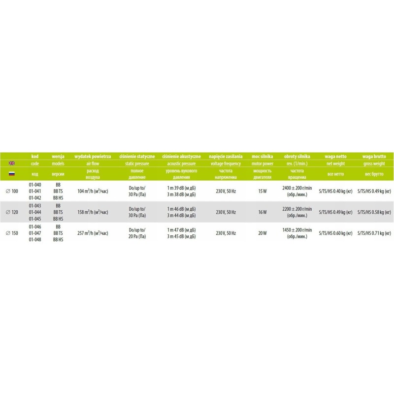 Specyfikacja techniczna wentylatora aRid FI 150 BB Standard