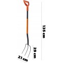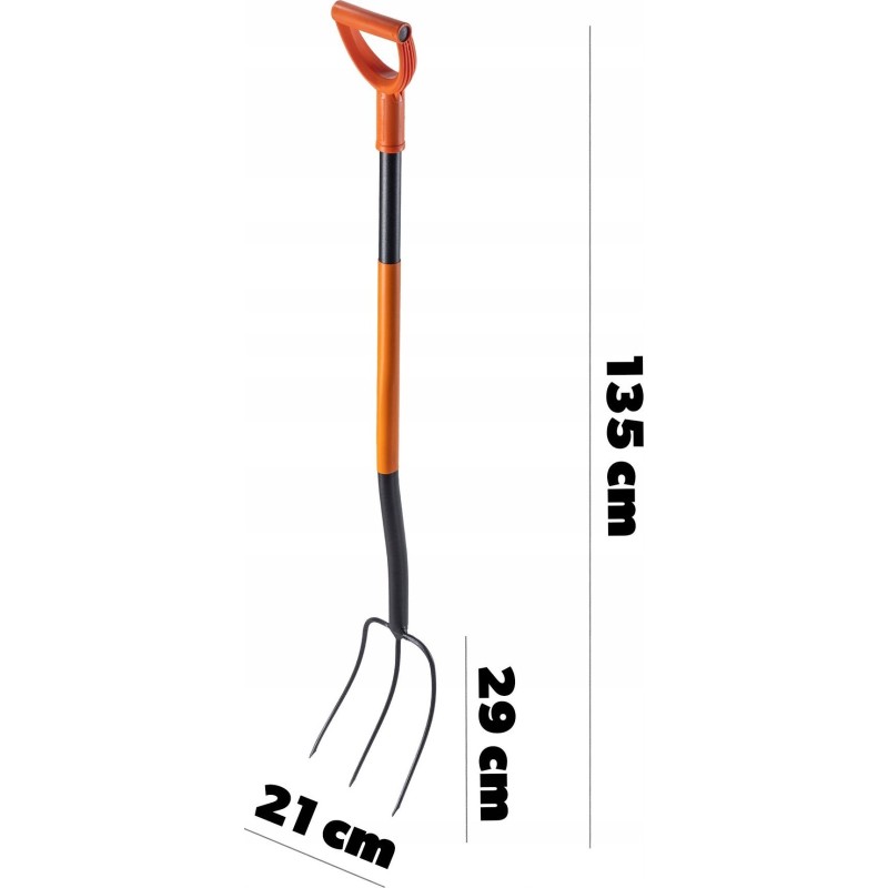Oferowane widły ogrodowe mają aż 135 cm długości. Długi trzonek daje możliwość wygodnego operowania narzędziem bez nadmiernego obciążania kręgosłupa, które ma miejsce w przypadku krótszych trzonów.