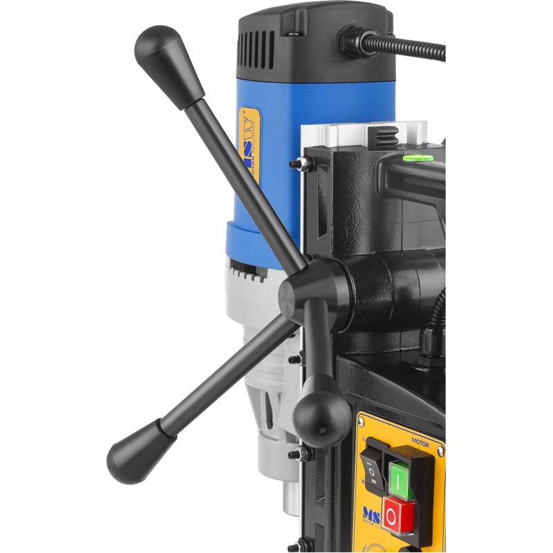 Łatwa obsługa sprzętu to zasługa dużych przycisków ulokowanych po jednej stronie wiertarki. Dzięki nim można uruchomić silnik i elektromagnes oraz wybrać kierunek wiercenia. Znajduje się tam również bezstopniowe pokrętło do regulacji prędkości. O właściwe zachowanie kąta ustawienia maszyny dba wbudowana poziomnica.
