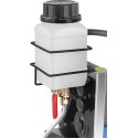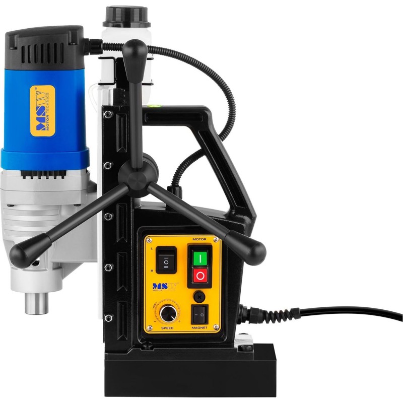 W wiertarce zamontowano system chłodzenia służący do zmniejszenia temperatury wiertła podczas pracy. Składa się on ze zbiornika o pojemności 300 ml oraz rurki o długości 50 cm. Wpływa to na efektywność podczas obróbki metalowych elementów i przedłuża żywotność wiertła. Łatwa obsługa sprzętu to zasługa dużych przycisków ulokowanych po jednej stronie wiertarki. Dzięki nim można uruchomić silnik i elektromagnes oraz wybrać kierunek wiercenia. Znajduje się tam również bezstopniowe pokrętło do regulacji prędkości. O właściwe zachowanie kąta ustawienia maszyny dba wbudowana poziomnica. Bezpieczne korzystanie jest zapewniony przez wyłącznik magnetyczny RCD, chroniący przed porażeniem i przypadkowym włączeniem. Dołączone do zestawu bezpieczniki ochronią obwód elektryczny przed przeciążeniem. Dodatkowo zastosowano blokadę, która uniemożliwi uruchomienie wiertarki, gdy elektromagnes jest wyłączony.