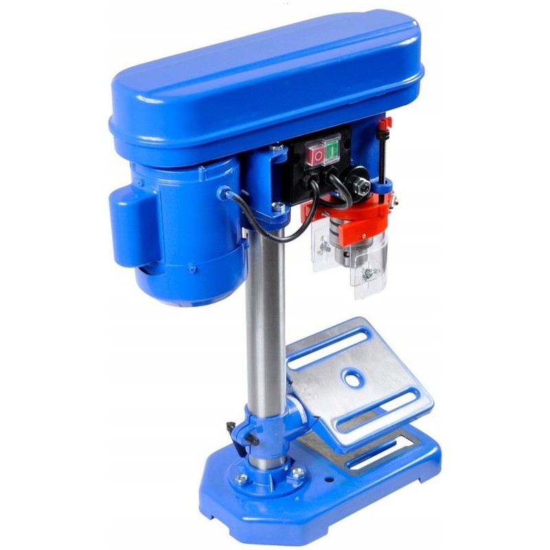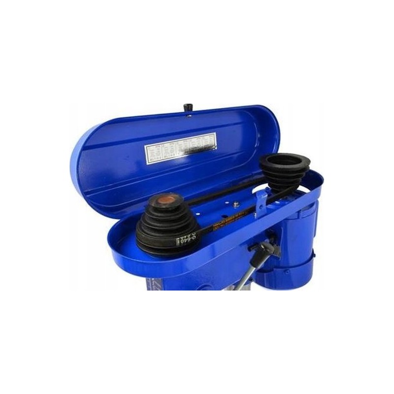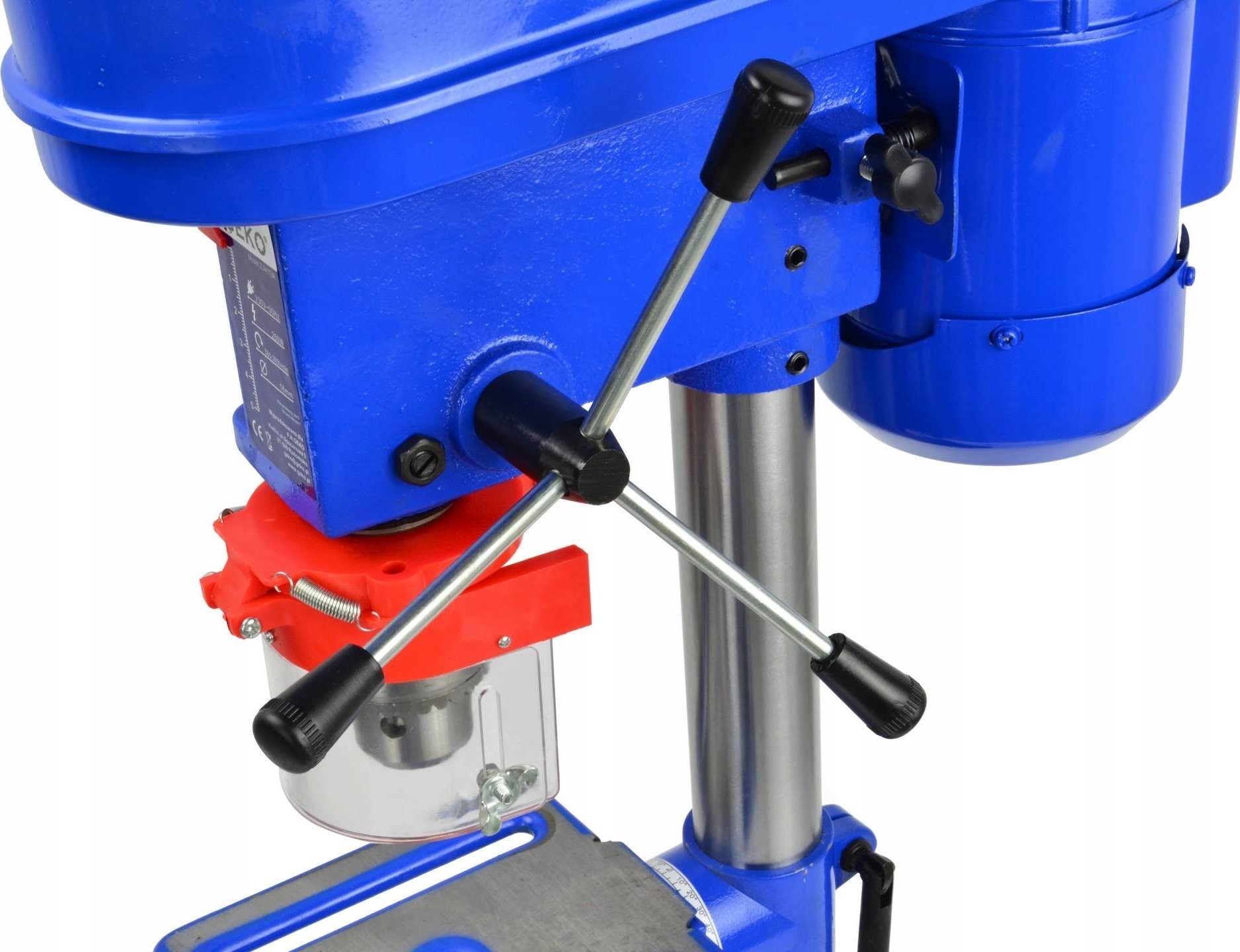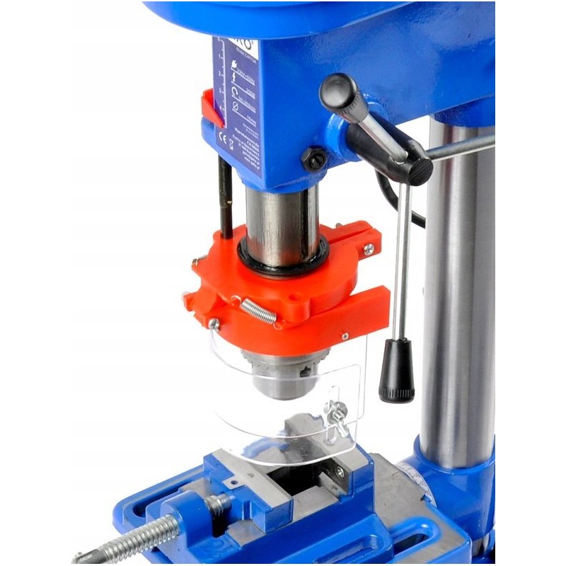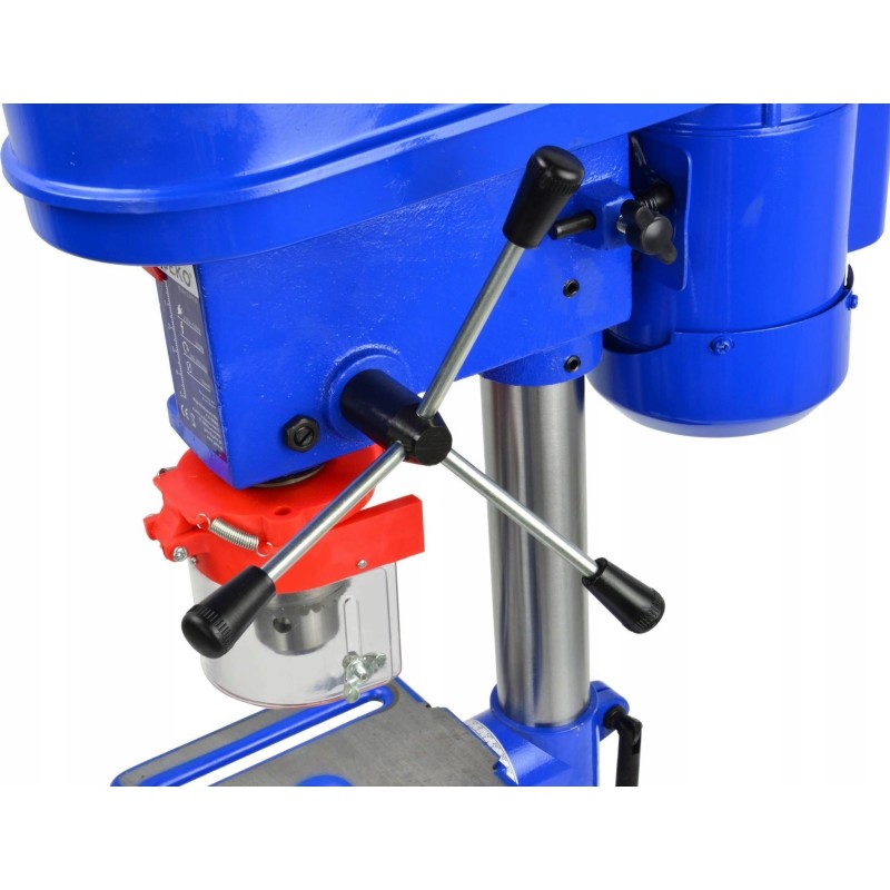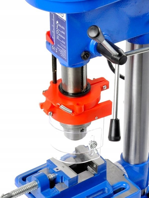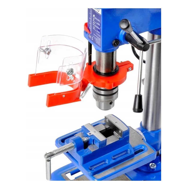 Wiertarka kolumnowa jest wyposażona w uchwyt do wiertła o średnicy 16mm. Aby zwiększyć bezpieczeństwo pracy, urządzenie zostało wyposażone w regulowane zabezpieczenie dla części roboczej.