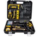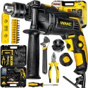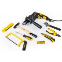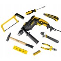 W skład zestawu wchodzi nie tylko wiertarka, ale również szeroki wybór narzędzi, które pozwalają na natychmiastowe rozpoczęcie pracy po zakupie. W zestawie znajdują się m.in. szczypce uniwersalne, poziomica, piła do metalu, nóż łamany, klucz szwedzki, młotek oraz miarka zwijana. Dzięki temu użytkownik ma wszystko, co niezbędne do skutecznego wykonania zadań.