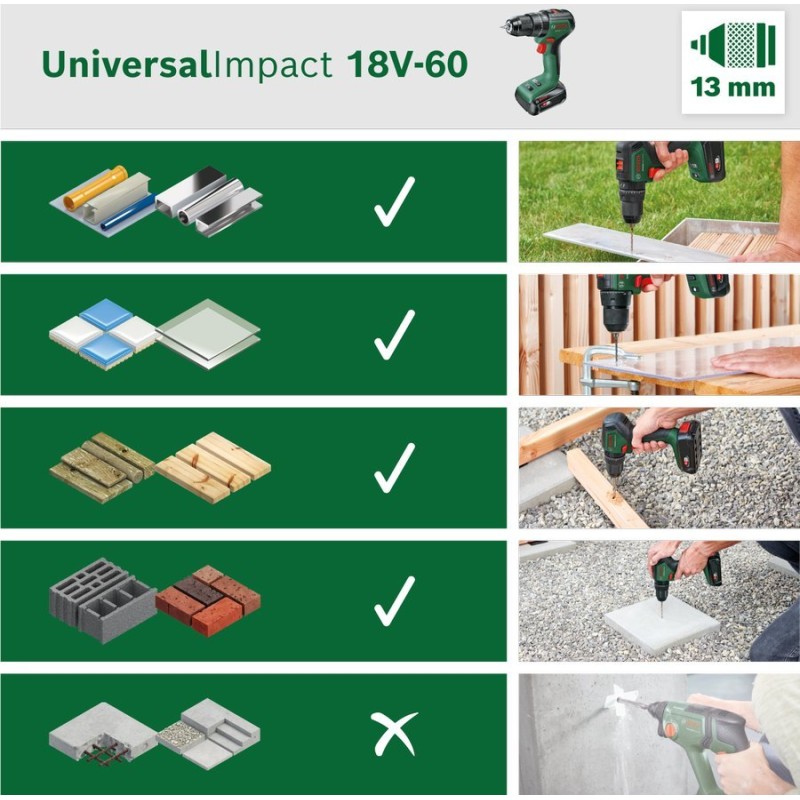 Wykonuj liczne projekty bez wysiłku dzięki imponującej wydajności i długiemu czasowi pracy modelu UniversalImpact 18V-60. To lekkie i wszechstronne elektronarzędzie oferuje 20 zakresów momentu obrotowego, 2-biegową przekładnię oraz tryb wiercenia udarowego, zapewniając większą elastyczność i kontrolę podczas pracy. Za niezwykłą wydajnością tego elektronarzędzia stoi technologia silników bezszczotkowych Bosch: narzędzie szybko i płynnie wkręca wkręty oraz wierci w drewnianych belkach, metalu i murze, zapewniając większy komfort pracy. Użytkownicy docenią wytrzymały uchwyt metalowy 13 mm, który gwarantuje bezpieczne zamocowanie wierteł i końcówek wkręcających. Narzędzie jest częścią POWER FOR ALL ALLIANCE. Jeden akumulator może być wykorzystywany do zasilania wielu narzędzi różnych marek.