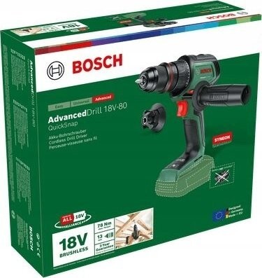 Model Bosch AdvancedDrill 18V-80 łączy funkcje wydajnego wiercenia i wkręcania z optymalną elastycznością. Dzięki wysokiemu maksymalnemu momentowi obrotowemu 78 Nm i regulacji prędkości obrotowej umożliwia łatwe wykonanie każdego zadania – od nawiercania otworów do wkręcania wkrętów, śrub lub elementów mocujących w drewnie, metalu lub tworzywach sztucznych. To wytrzymałe narzędzie z silnikiem bezszczotkowym i zdejmowanym metalowym uchwytem wiertarskim zostało skonstruowane, aby zapewnić trwałość. Uchwyt wiertarski 13 mm umożliwia montaż różnych wierteł i końcówek wkręcających, otwornic oraz osprzętu. Możliwość zamocowania nasadki magnetycznej to funkcja przydatna podczas zastosowań związanych z wkręcaniem, ponieważ wkrętów nie trzeba przytrzymywać ręką. Ta wysoce wydajna wiertarko-wkrętarka jest wyposażona w interfejs QuickSnap, dzięki czemu można wymienić uchwyt wiertarski na dodatkowo dostępne adaptery, aby pracować w miejscach trudno dostępnych. Rękojeść dodatkowa zapewnia lepszą kontrolę i stabilność, co oznacza komfort i mniejsze zmęczenie pracą. Wbudowana technologia Bosch Syneon Technology zapewnia optymalną moc i maksymalny czas pracy. Elektronarzędzie jest częścią systemu 18V POWER FOR ALL. Możliwość zastosowania jednego akumulatora do wszystkich elektronarzędzi 18V POWER FOR ALL.