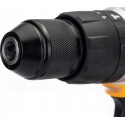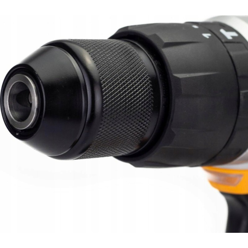 Narzędzie oferuje dwubiegową regulację obrotów, co pozwala na dostosowanie prędkości do rodzaju wykonywanej pracy. Maksymalna częstotliwość udaru wynosi 25600 ud/min, a wiertarko-wkrętarka posiada 16 pozycji sprzęgła przeciążeniowego, co zwiększa jej wszechstronność.