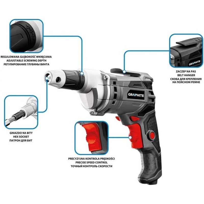 Nowoczesna wiertarko-wkrętarka sieciowa od marki GRAPHITE, o dużej mocy 520 W. Urządzenie charakteryzuje się możliwością regulacji obrotowej za pośrednictwem blokady włącznika oraz stopnia nacisku włącznika. Maksymalna osiągana przez nie prędkość to 4 200 obrotów na minutę.