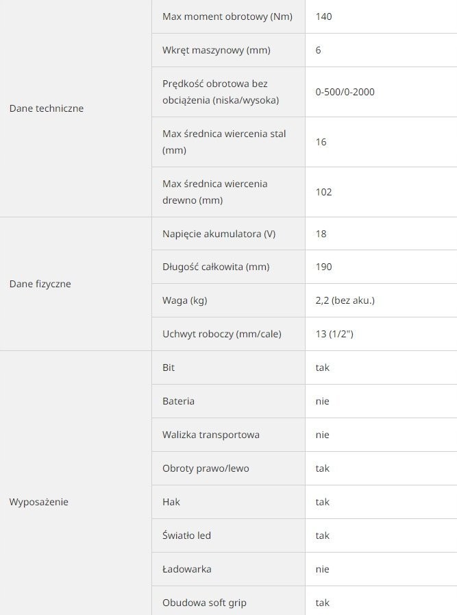 - Posiada wysoki moment obrotowy wynoszący 140 Nm oraz imponującą prędkość wiercenia, co czyni ją uniwersalnym narzędziem do wiertła, otwornic i koron wiertarskich.