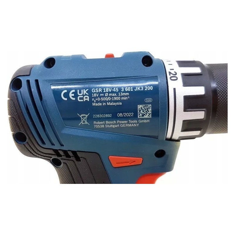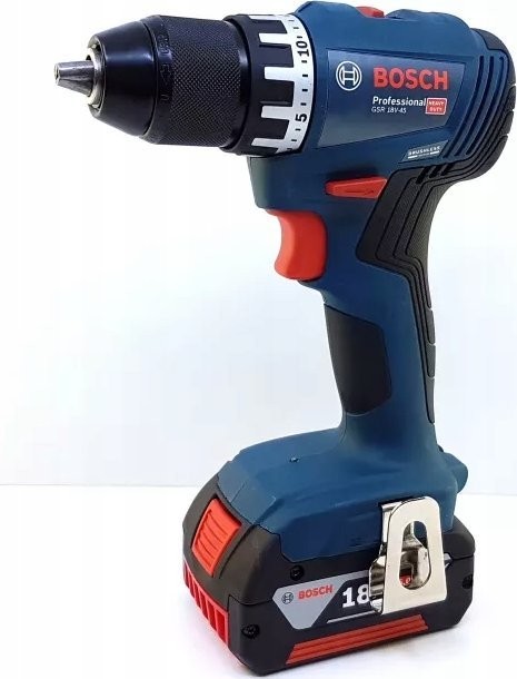- punkt znaku wypunktowania: Nowy model GSR 18-45 z silnikiem bezszczotkowym, maksymalnym momentem obrotowym 45 Nm i prędkością obrotową 1900 min, Do wszystkich standardowych zastosowań: wytrzymała metalowa podszewka 13 mm zapewnia doskonałe przenoszenie momentu obrotowego, Doskonała obsługa: lekka konstrukcja z tylko 159 mm długości głowy i klipsem do paska dla łatwego noszenia, Akumulatory i ładowarki są w pełni kompatybilne z systemem Bosch Professional 18 V oraz z wieloma innymi narzędziami marki AMPShare,
