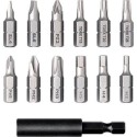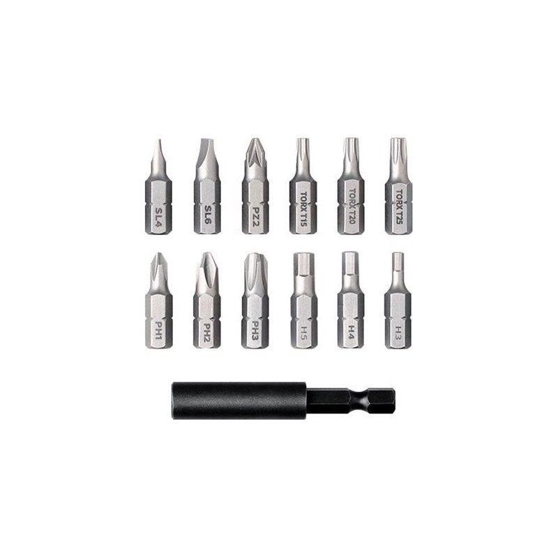 Za pomocą tylnego pokrętła w szybki sposób zmienisz kierunek wkręcania/wykręcania śruby. Podczas dłuższego używania urządzenie nie ślizga się w rękach. Do zestawu dołączono zestaw 12 końcówek wykonanych z najwyższej jakości stali S2. Dodatkowa przedłużka umożliwia dostęp do wąskich i trudno dostępnych miejsc. Cały zestaw zapakowano w poręczne etui, dzięki któremu wszystkie elementy masz w jednym miejscu.