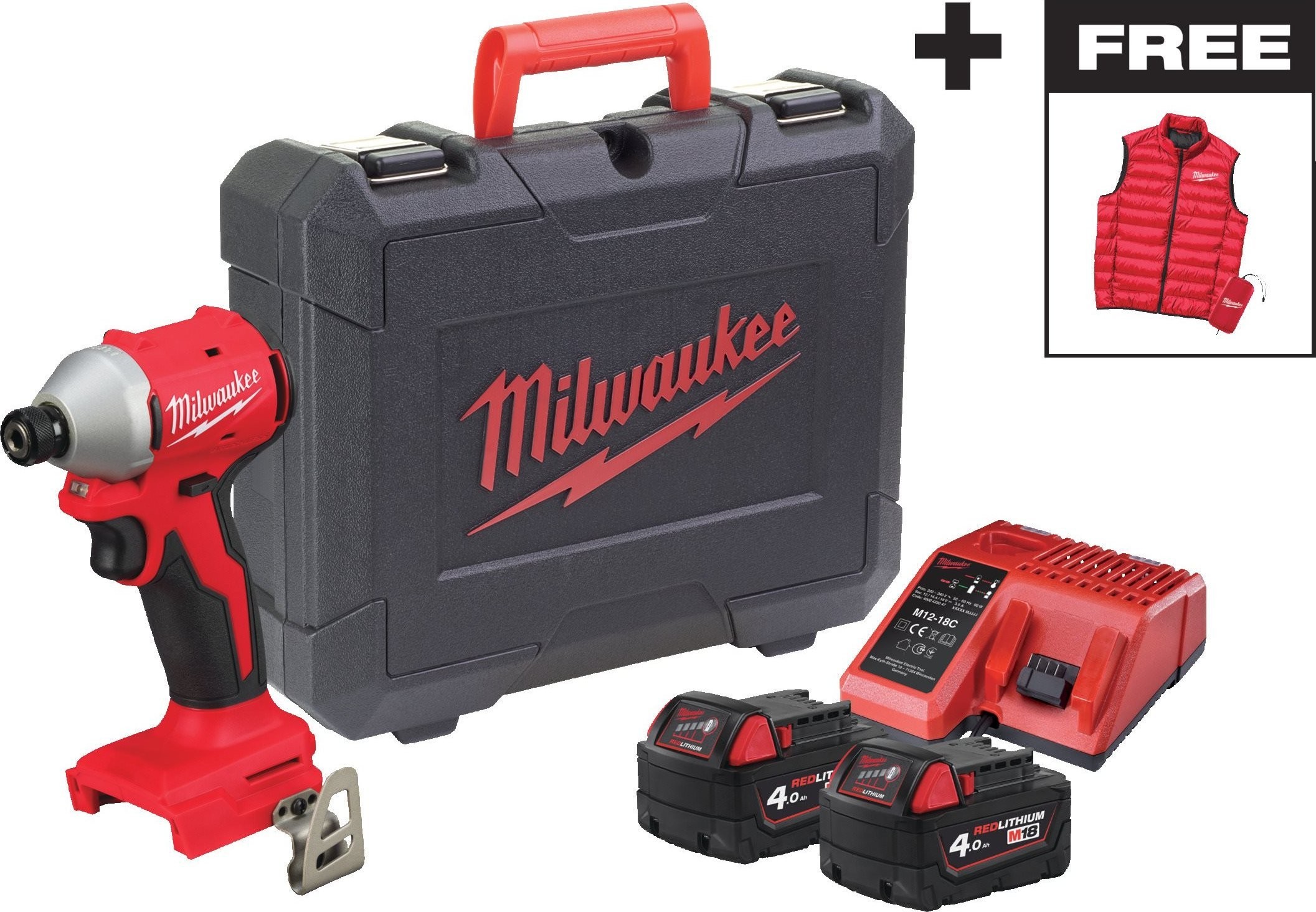 - Zawartość zestawu: 2 x M18 B4 akumulator, M12-18 C ładowarka, walizka narzędziowa, kamizelka Milwaukee® PUFI