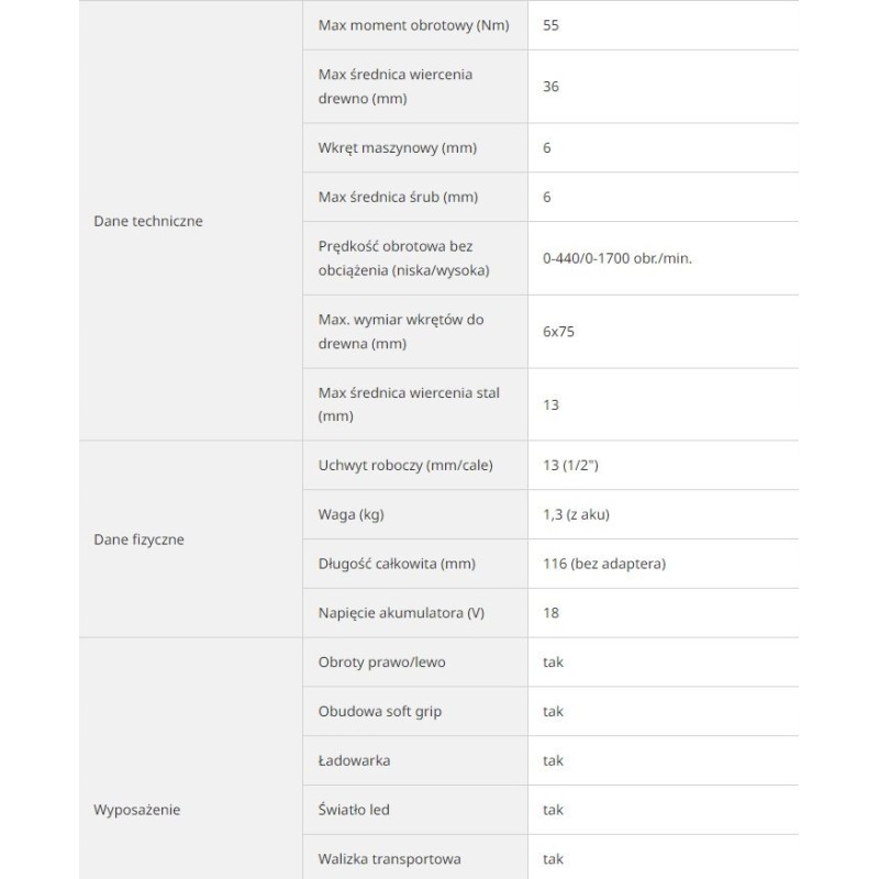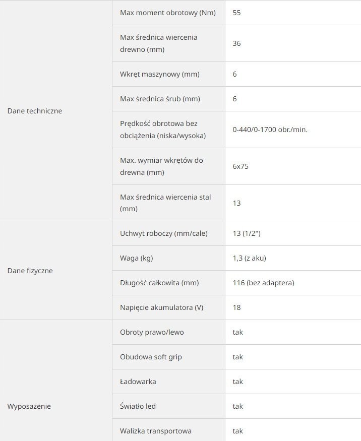 - Napięcie akumulatora (V): 18