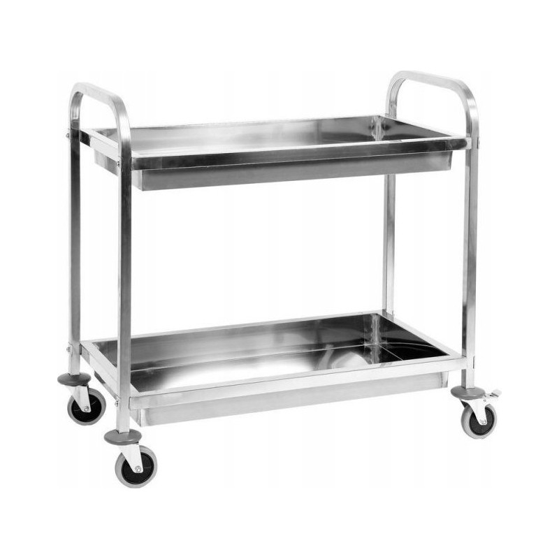 Wózek kelnerski z dwiema głębokimi półkami - YG-09099 Wykonany ze stali nierdzewnej SS 201 Wózek transportowy marki YATO sprawdzi się w restauracjach, hotelach, stołówkach oraz innych punktach zbiorowego żywienia a także w firmach cateringowych umożliwiając wygodne przewożenie potraw, naczyń i akcesoriów. Może być także przydatny w biurach, bibliotekach, warsztatach czy laboratoriach pozwalając na wygodny transport rożnego rodzaju ciężkich przedmiotów. Wózek wykonany został z wysokiej jakości, trwałej odpornej na korozję a jednocześnie łatwej w utrzymaniu w czystości stali nierdzewnej SS 201. Wózek posiada 2 głębokie półki o wymiarach 82 x 43 cm i nośności do 45 kg. Wysoki rant (9cm) zapobiega zsuwaniu się przewożonych artykułów. Na spodzie każdej półki umieszczono dźwiękochłonne maty, redukujące drgania. Wózek posiada 4 skrętne kółka wykonane z tworzywa TPR, dzięki czemu jest on zwrotny, porusza się cicho i nie niszczy powierzchni podłogi. Każde z kółek posiada odbojnik, a 2 wyposażono także w hamulce postojowe. Specyfikacja Artykuł Wózek kelnerski z 2 głębokimi półkami Nr katalogowy YG-09099 Stan artykułu Nowy Materiał Stal nierdzewna SS201 Liczba pólek 2 Wymiar jednej półki 82 x 43 cm Głębokość półki 9 cm Nośność jednej półki do 45 kg Odległość między półkami 50 cm Maty dźwiękochłonne Tak Materiał kółek Guma termoplastyczna (TPR) Typ kółek Skrętne z łożyskami Hamulce Dwa kółka z hamulcami Wymiary (DxSxW) 95 x 50 x 95 cm Waga 10,4 kg W skład zestawu wchodzą: Wózek kelnerski Akcesoria montażowe Instrukcja obsługi