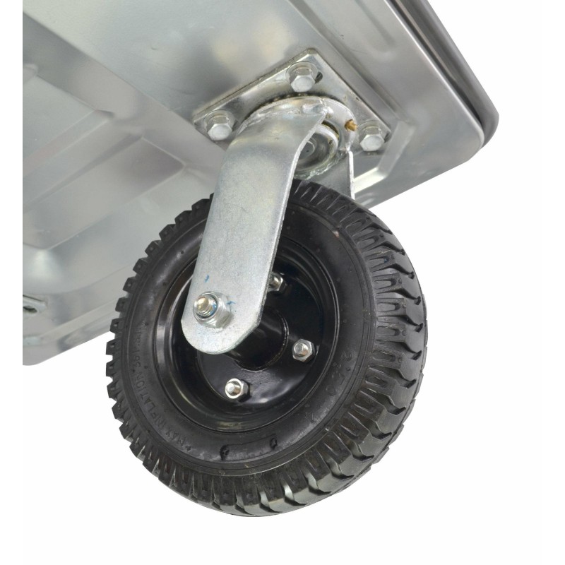 Wyposażony w pneumatyczne 2 koła skrętne i 2 stałe z łożyskami i gumowymi oponami bieżnikowanymi.