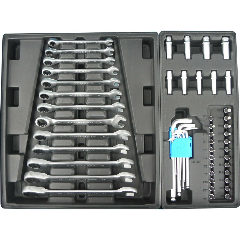 Ilość elementów: 245 - dokładka lista poniżej w opisie. Koła transportowe: tak, z hamulcem. Wymiary (dł. / szer. / wys.): 90 cm / 68,5 cm / 45,5 cm. Wymiary stołu: 77 x 46 cm. Ilość szuflad: 6 (4 z wyposażeniem i 2 puste). Obudowa: stalowa, malowana proszkowo. Cechy dodatkowe: zamek na kluczyk, prowadnice szuflad na łożyskach kulkowych, dodatkowy uchwyt transportowy.