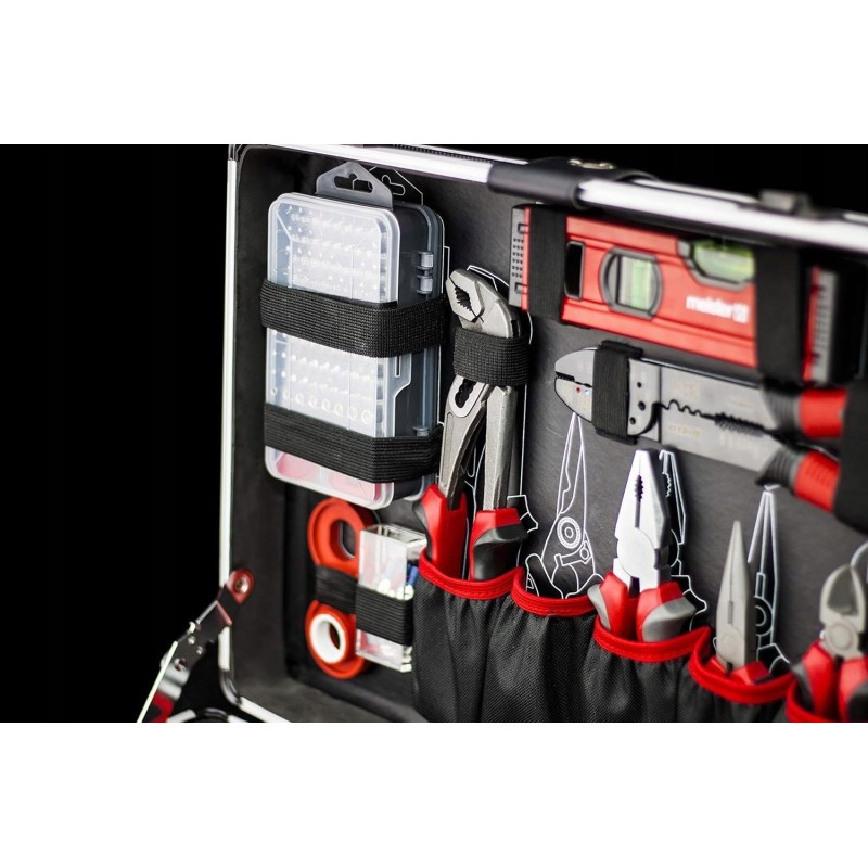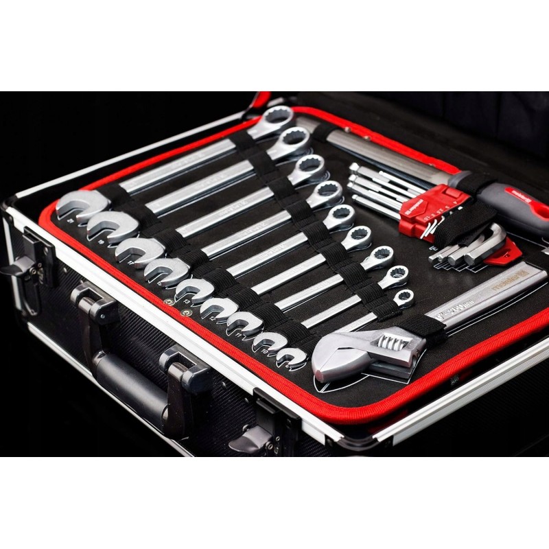 - Dodatkowe cechy: kontury narzędzi ułatwiają sortowanie po użyciu | elastyczne paski i gumowe elementy zapewniają bezpieczne trzymanie | czytelne oznaczenia na nasadkach
