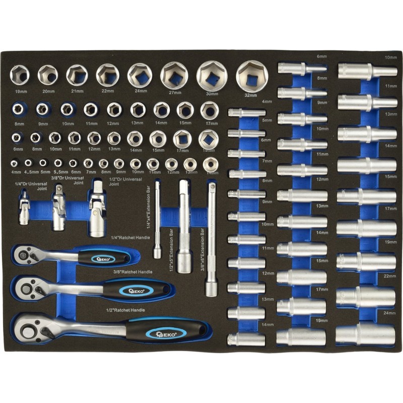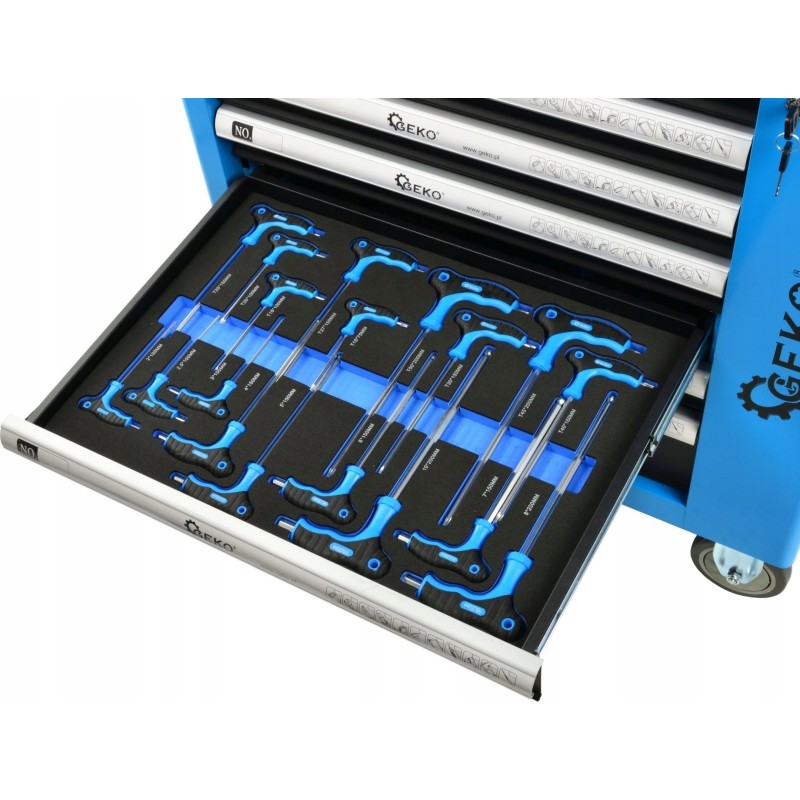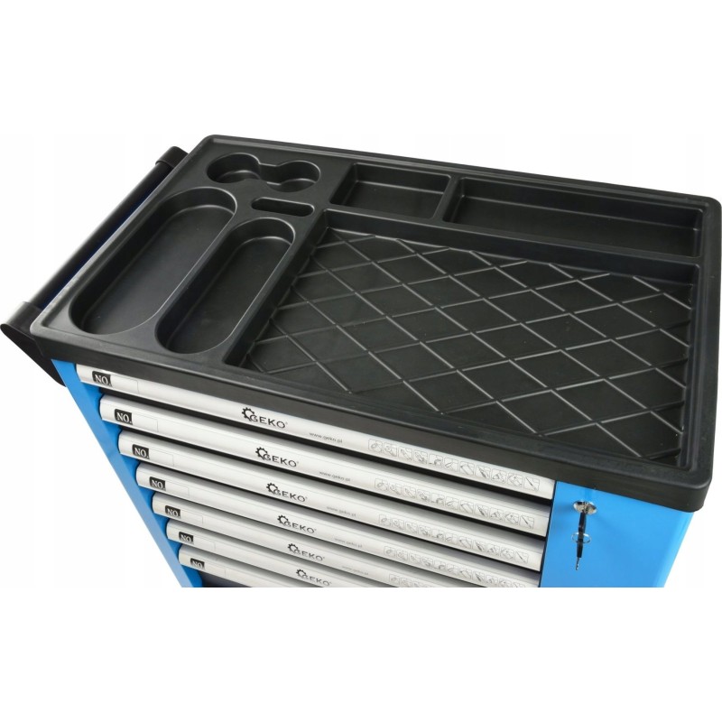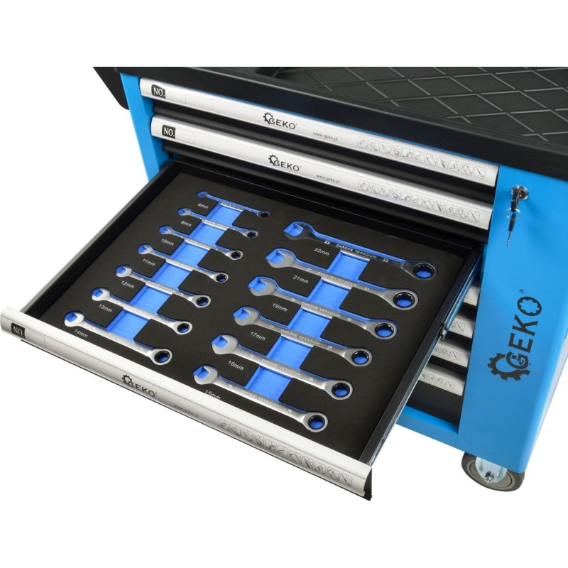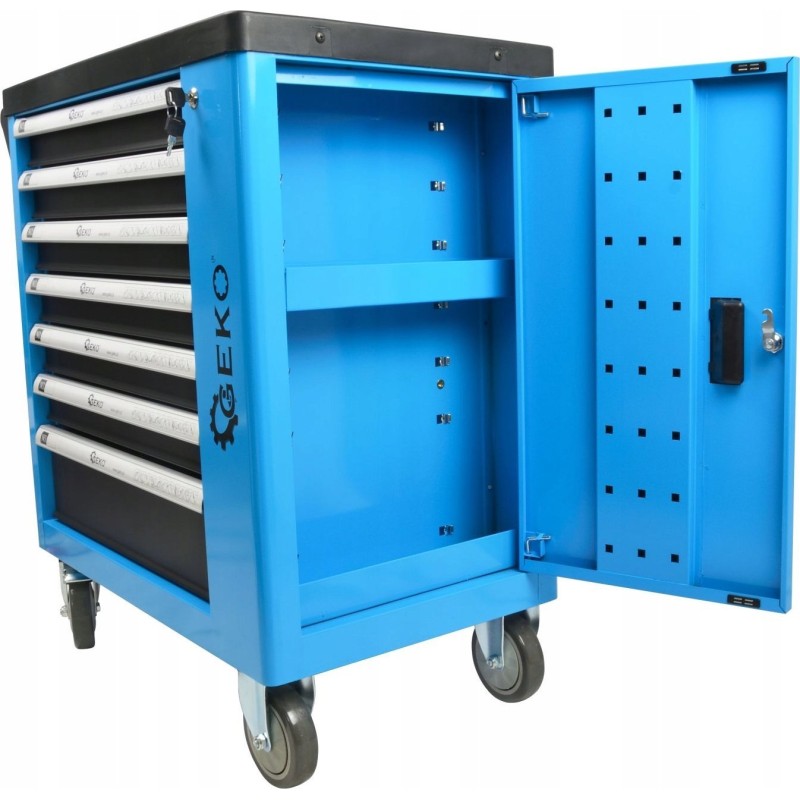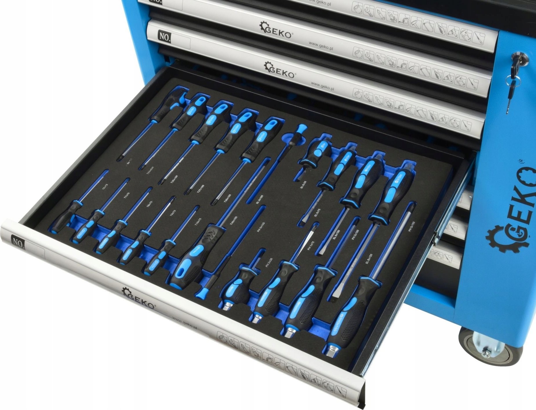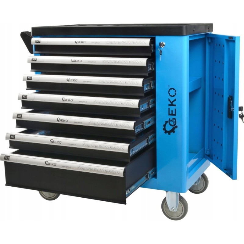 Profesjonalna szafka narzędziowa sprawdzonej marki GEKO z kompletnym 243el. wyposażeniem. Szafka posiada 7 praktycznych szuflad na narzędzia, zamykanych za pomocą kluczyka oraz dodatkowy również zamykany schowek boczny. Wszystkie elementy wchodzące w skład zestawu wykonane zostały z wytrzymałych i trwałych materiałów, co wyróżnia je spośród innych podobnych zestawów dostępnych na rynku.