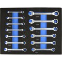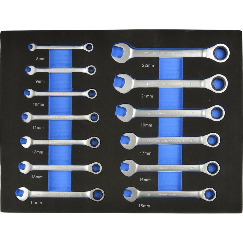 - Zestaw zawiera klucze o rozmiarach: 8, 9, 10, 11, 12, 13, 14, 15, 16, 17, 19, 20, 21, 22 mm