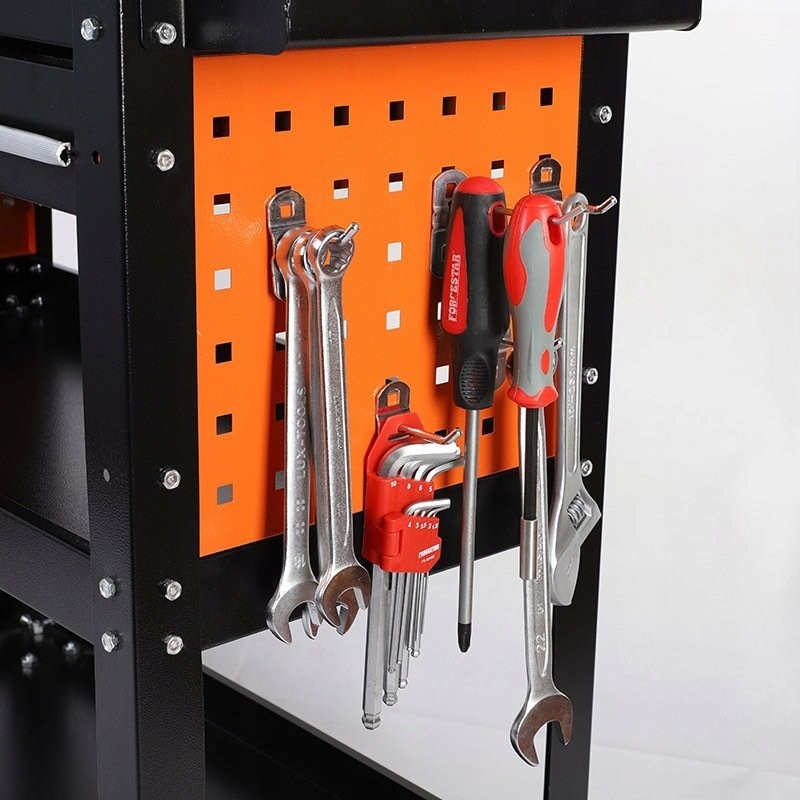 ✅ Korpus i półki wykonane są z wytrzymałej stali, co zapewnia stabilność konstrukcji i udźwig do 300kg. Boczne perforowane ścianki umożliwiają zamontowanie haczyków na narzędzia. Korpus posiada solidny uchwyt ułatwiający transport. Szafkę wyposażono w dużą, wytrzymałą kółka z polipropylenu, które charakteryzują się dużą odpornością na uszkodzenia mechaniczne. Zastosowane hamulce zabezpieczają i stabilizują wózek podczas pracy. Dwa z czterech kół są skrętne, co zapewnia wysoką mobilność i łatwość manewrowania.