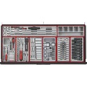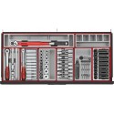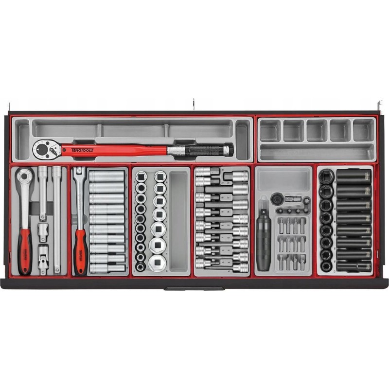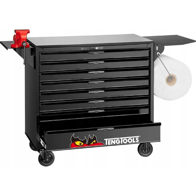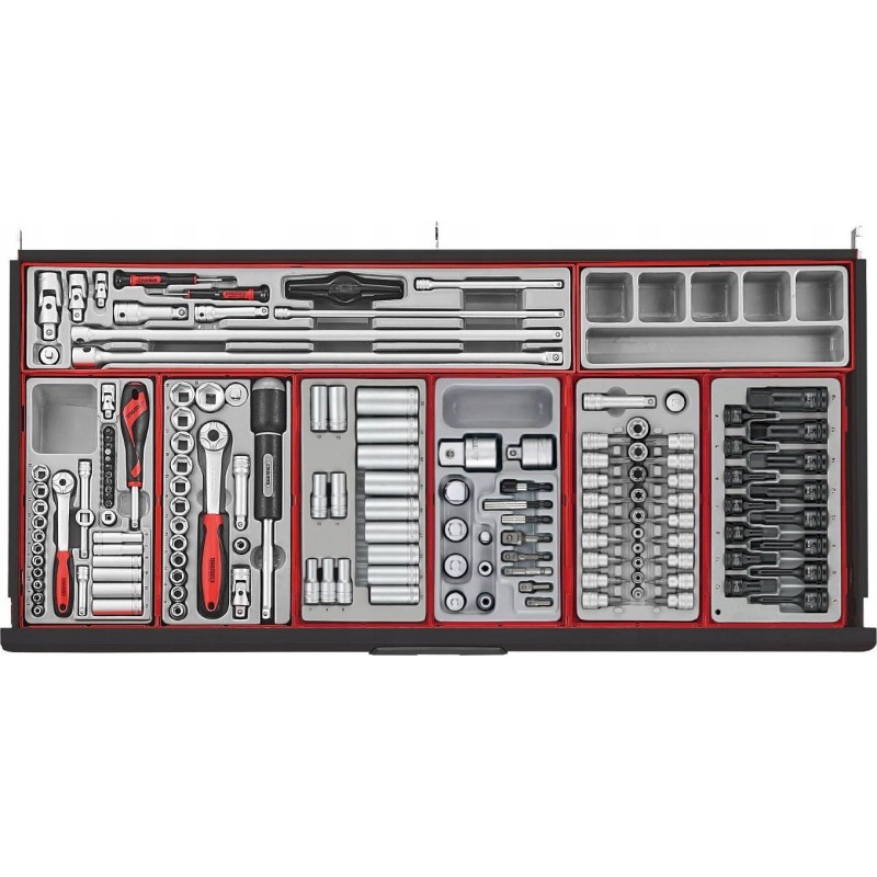 Kompletny zestaw narzędzi spełniający większość wymagań użytkowników. Wszystkie narzędzia są ułożone w zasobnikach z tworzywa, przy czym każde narzędzie ma swoje własne miejsce. Zestaw zawiera 1004 elementy. Dostarczany w w wózku narzędziowym TCW208NBK1 z 8 szufladami, z blatem roboczym, półką boczną z imadłe i uchwytem na papier. Papier nie jest na wyposażeniu.